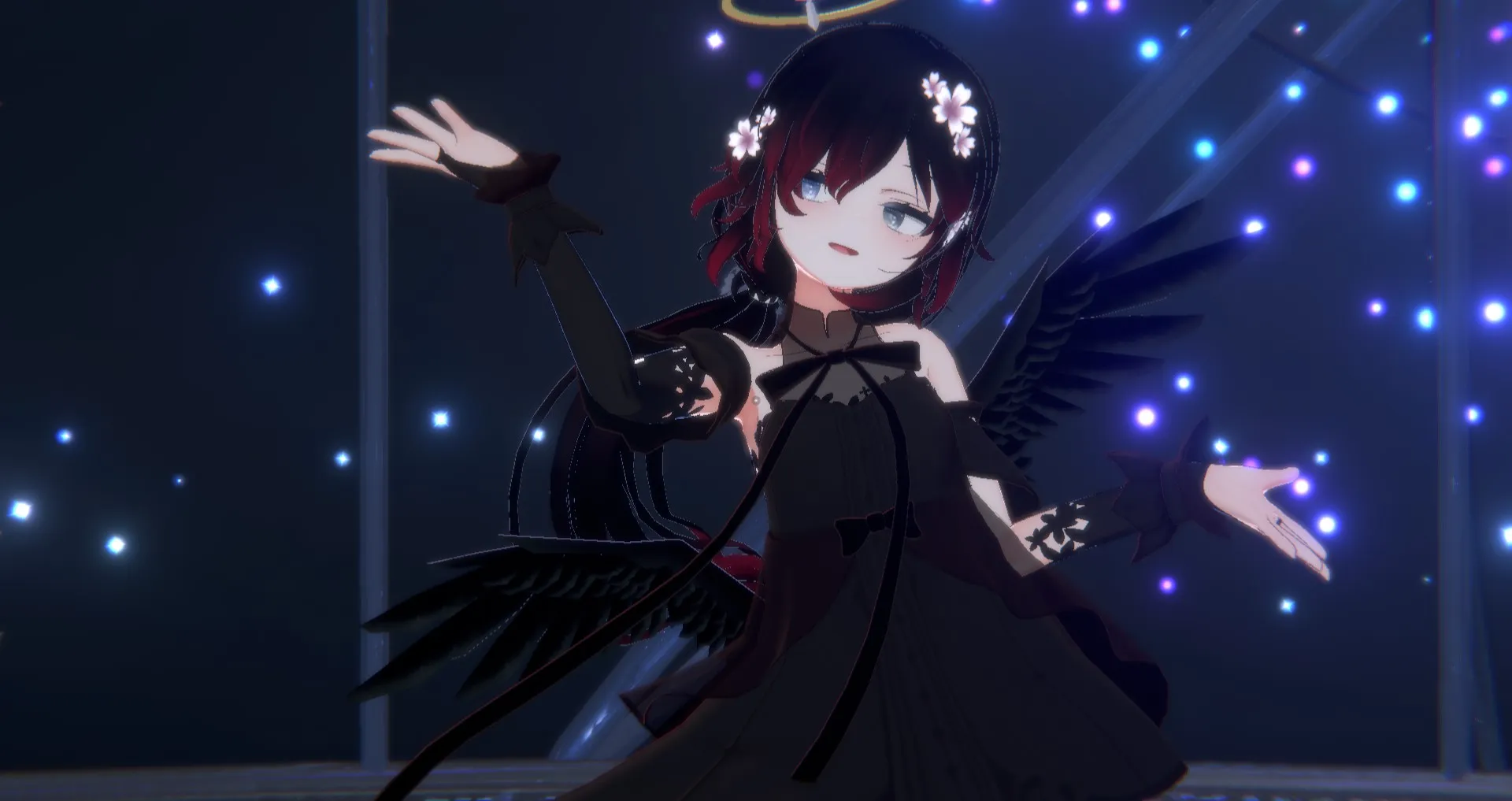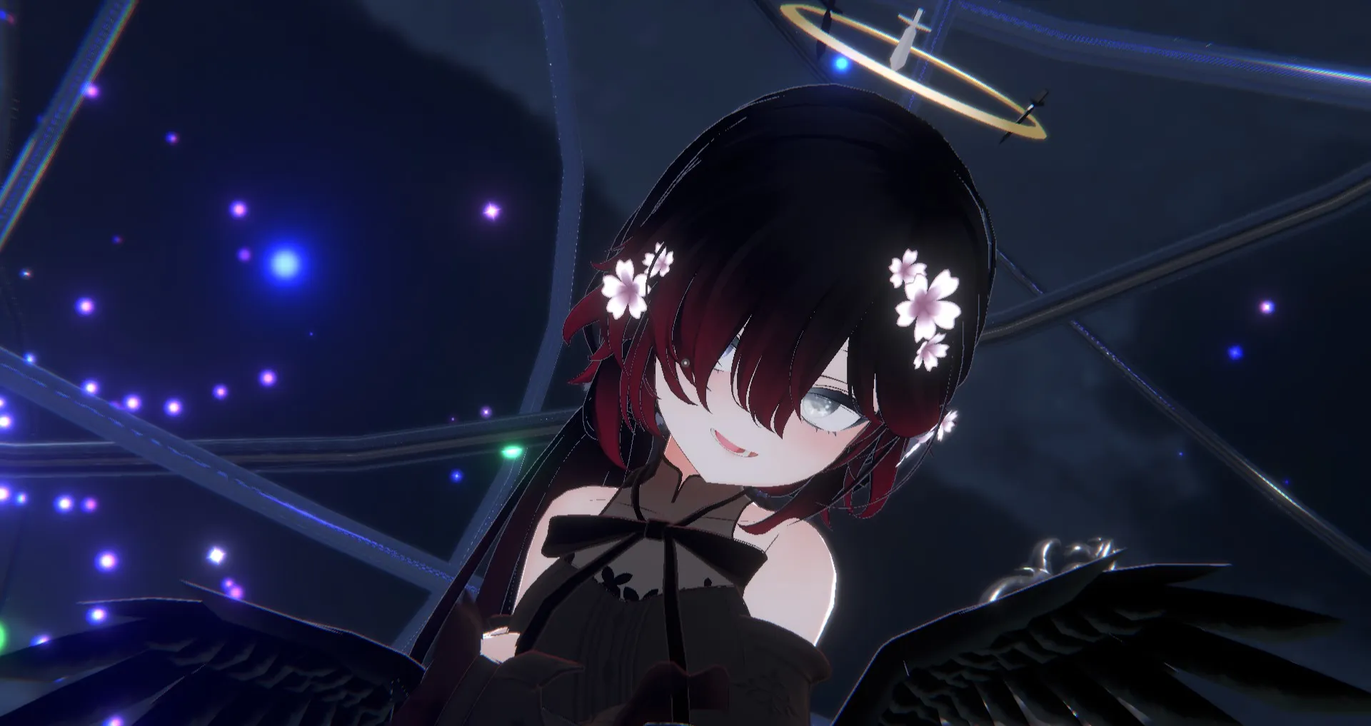 フィオナちゃんベースで改変をしております。nn最初に白い翼を足したのがきっかけで天使の輪を更に追加、そこで黒Ver.も見たくなり堕天させました。nn髪型は儚げローポニーを使っています、衣装はフィオナちゃん対応衣装では無かったため少し大変でした…nnこの二つでMMDワールドで踊ると妄想が捗って楽しいです!!