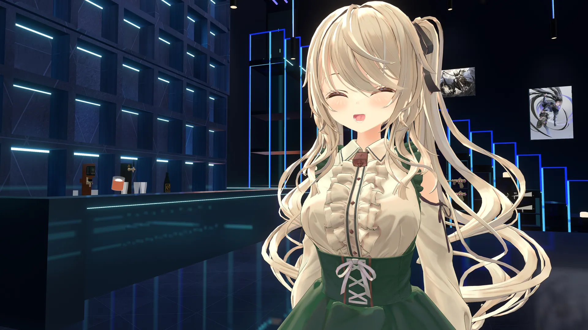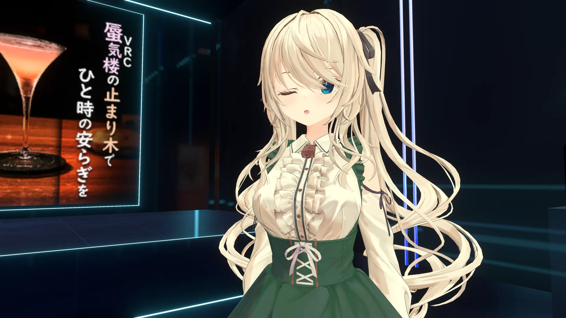 Qじゃぱん横丁の音楽イベント、Sound Bar QJPにて使用するために改変依頼(軽量化)しました。nnオリジナルからの変更点n・黒タイツ化n・ショーツをピンク系n・目を宝石テクスチャn・ワンピースを緑系nにしました。nn私では撮れませんけど、アニメーションでワイングラスも出せます。n