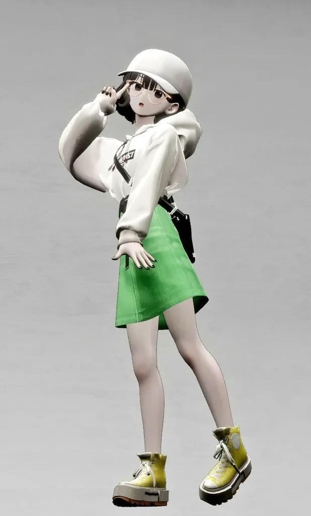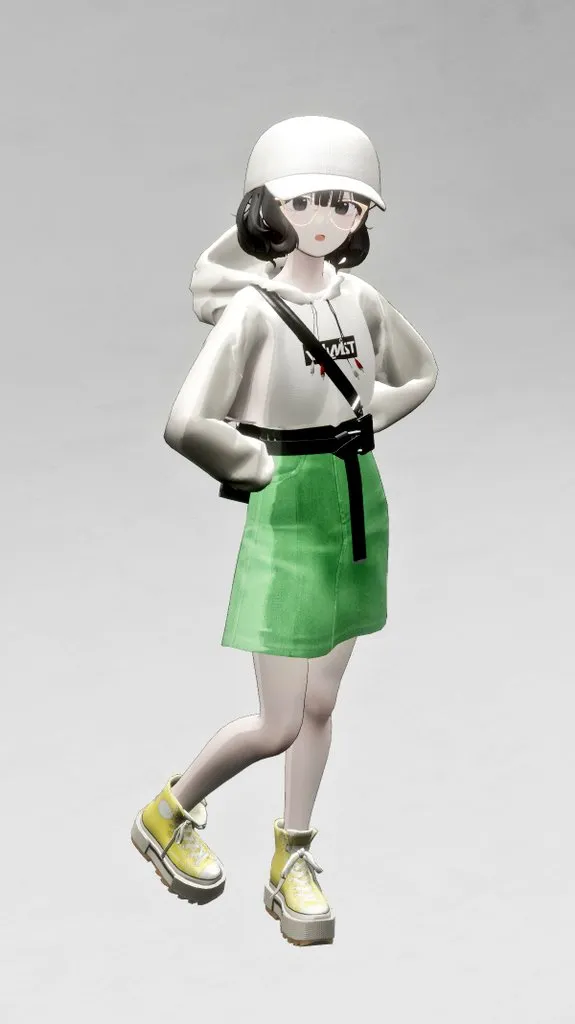 Grusを素体とし、トップスをデニムスカートと高めのウエスト位置で絞ったシルエット重視の改変です。nフードはサイズを大きめに、重めの厚底シューズを履くことでシルエットに緩急を持たせました。n