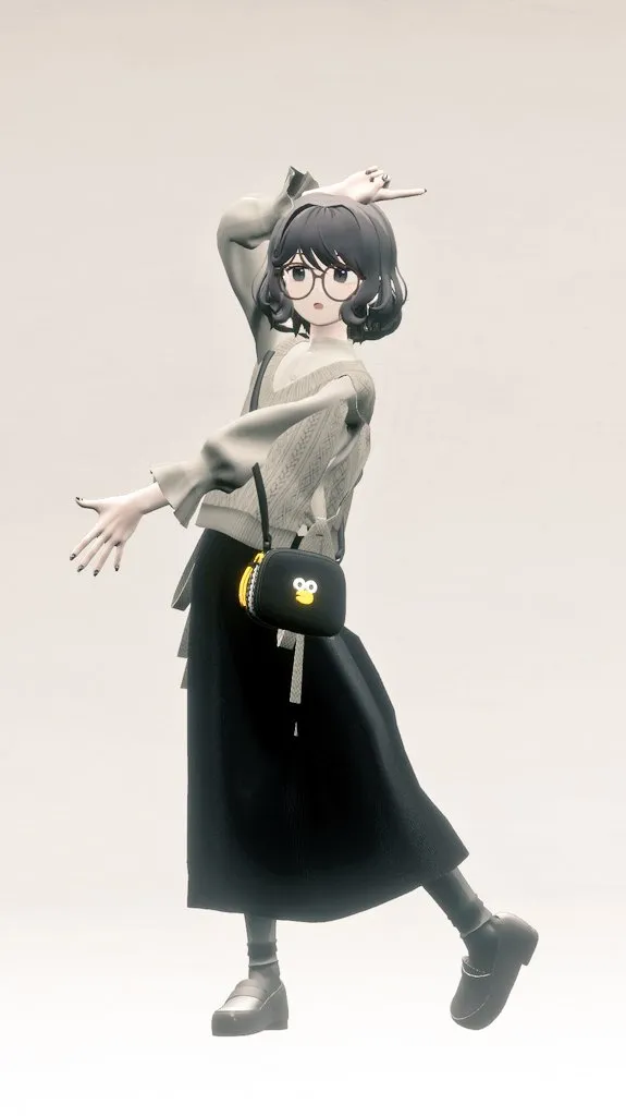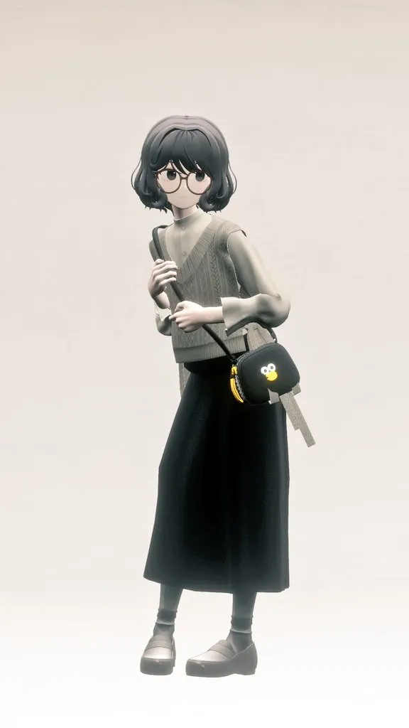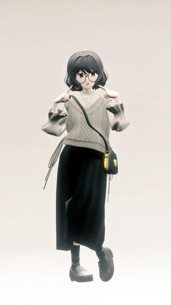 Grusを素体にニットベストとロングスカートを着せた改変です。nトップスのニットが持つ暖かい生地感を活かしたかったので全体的に派手な色を使用しないようにしています。が、それはそれで地味過ぎたため、不思議なモチーフが付いたバックや、濃い色のメガネで調整してみました。