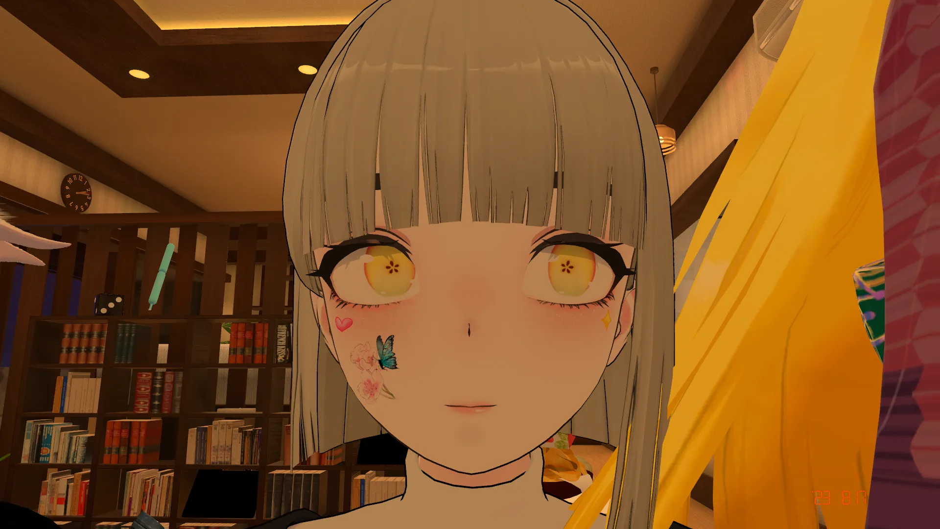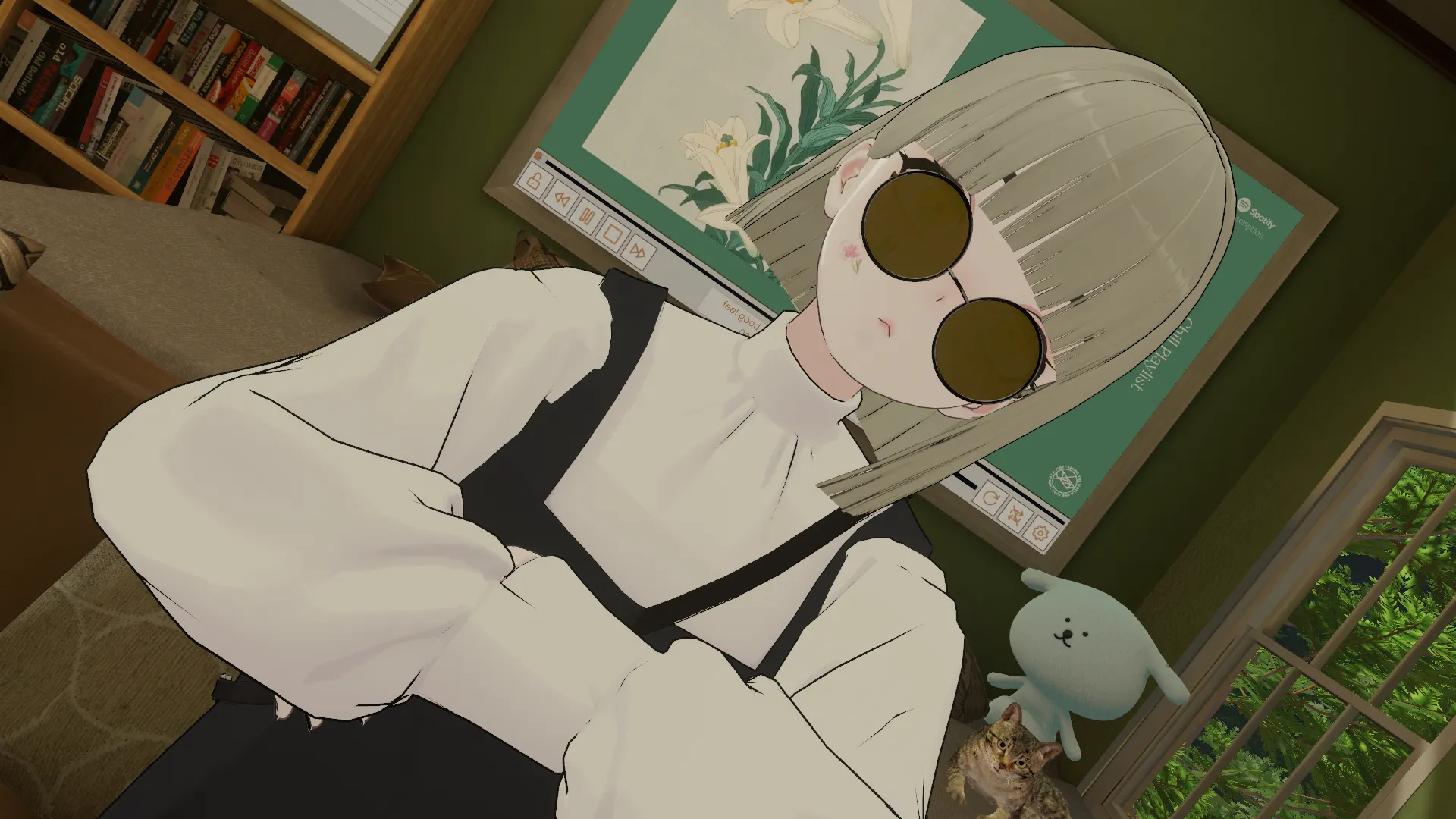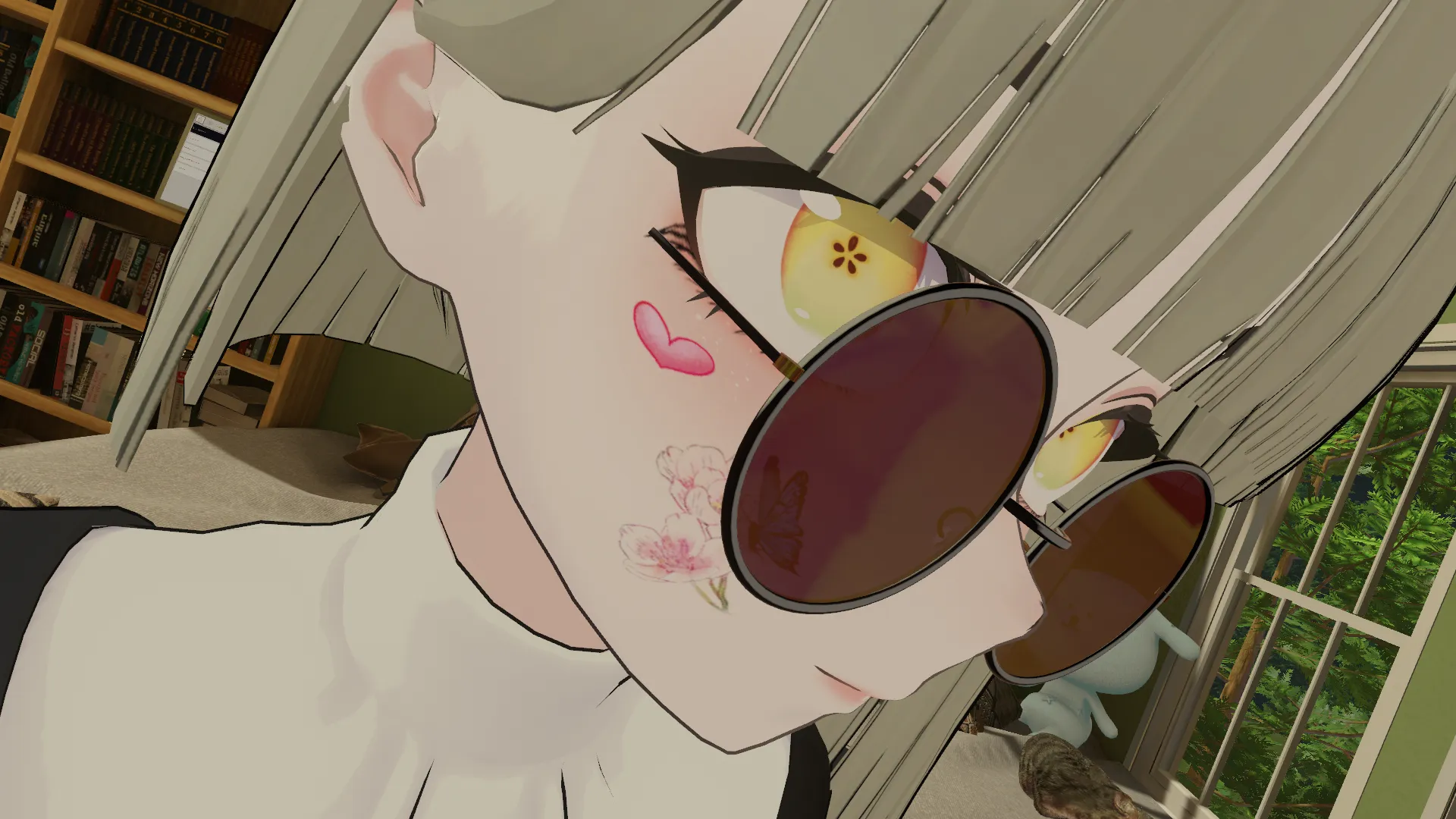 ギフトでもらったLapwingちゃんがベースです!nお洋服はデフォルトの衣装。髪型とフェイステクスチャを中心に改変しましたnnこだわりポイントをすべてサングラスで隠しちゃうのが逆にこだわり??nnアイテクスチャはいつも30分くらい悩んじゃう...n今回はM_vrcさんの「フルーティアイ」からAppleの断面図をモチーフに??