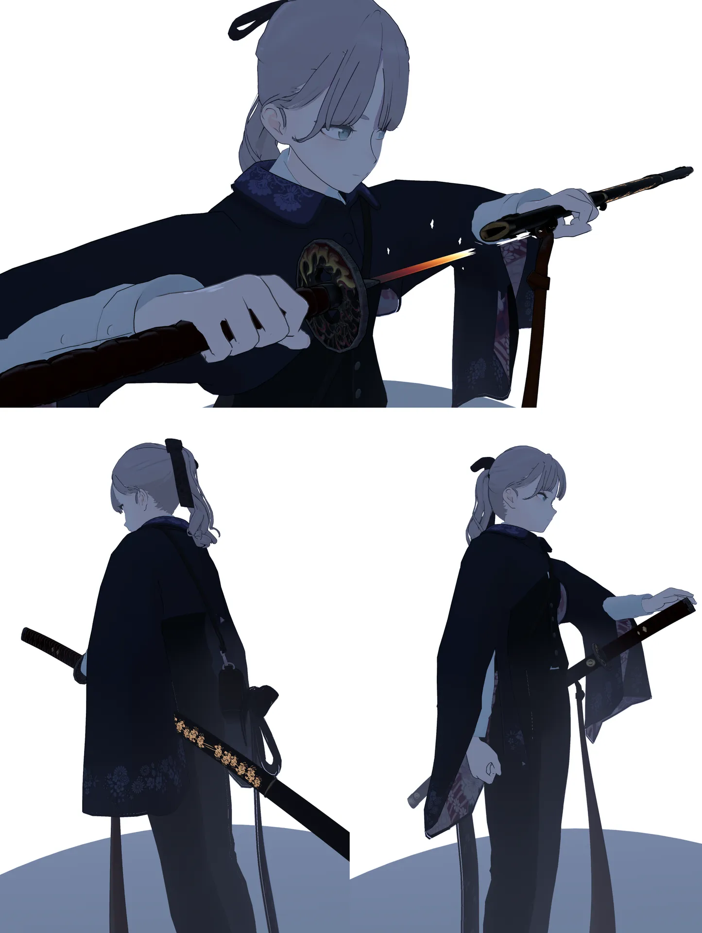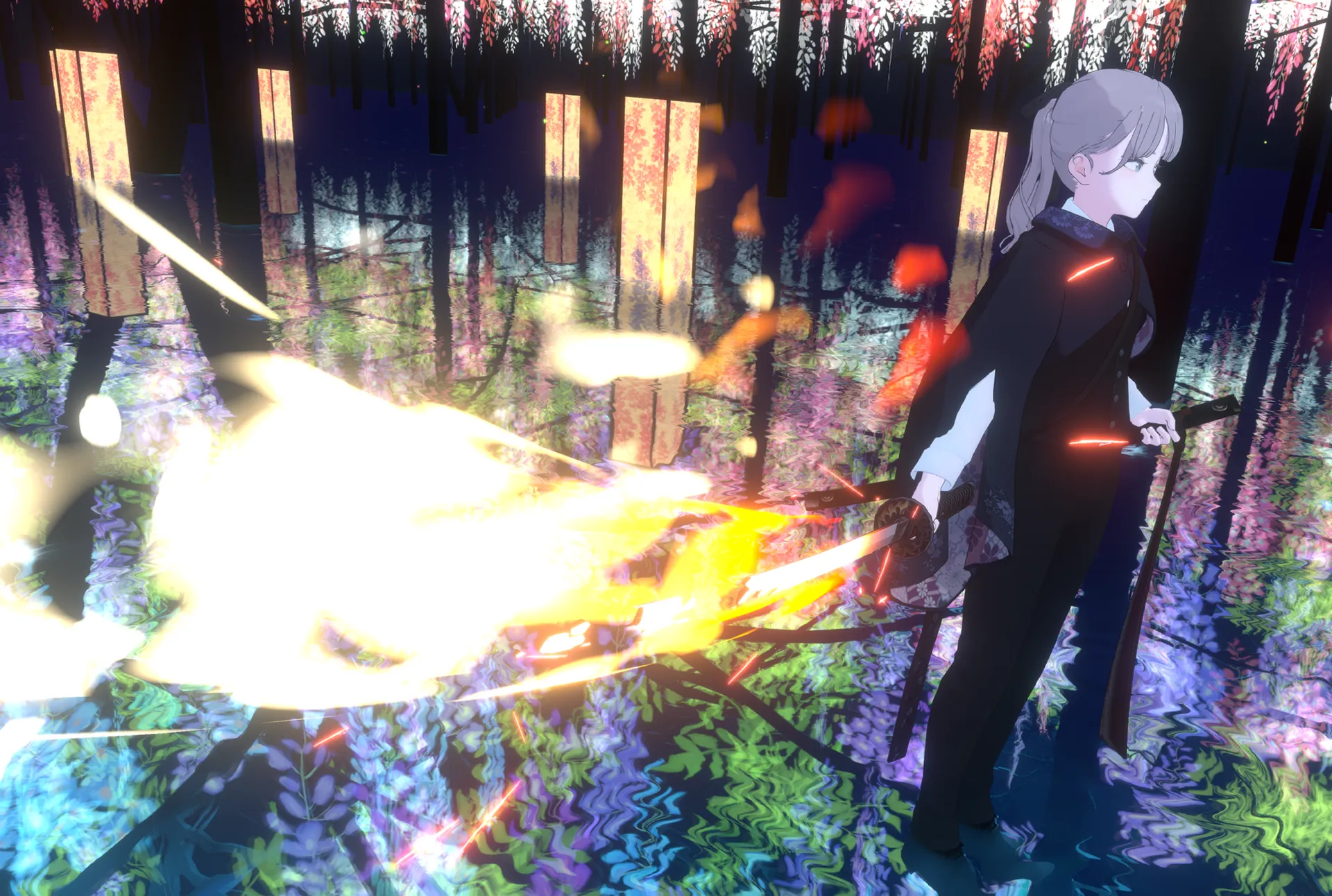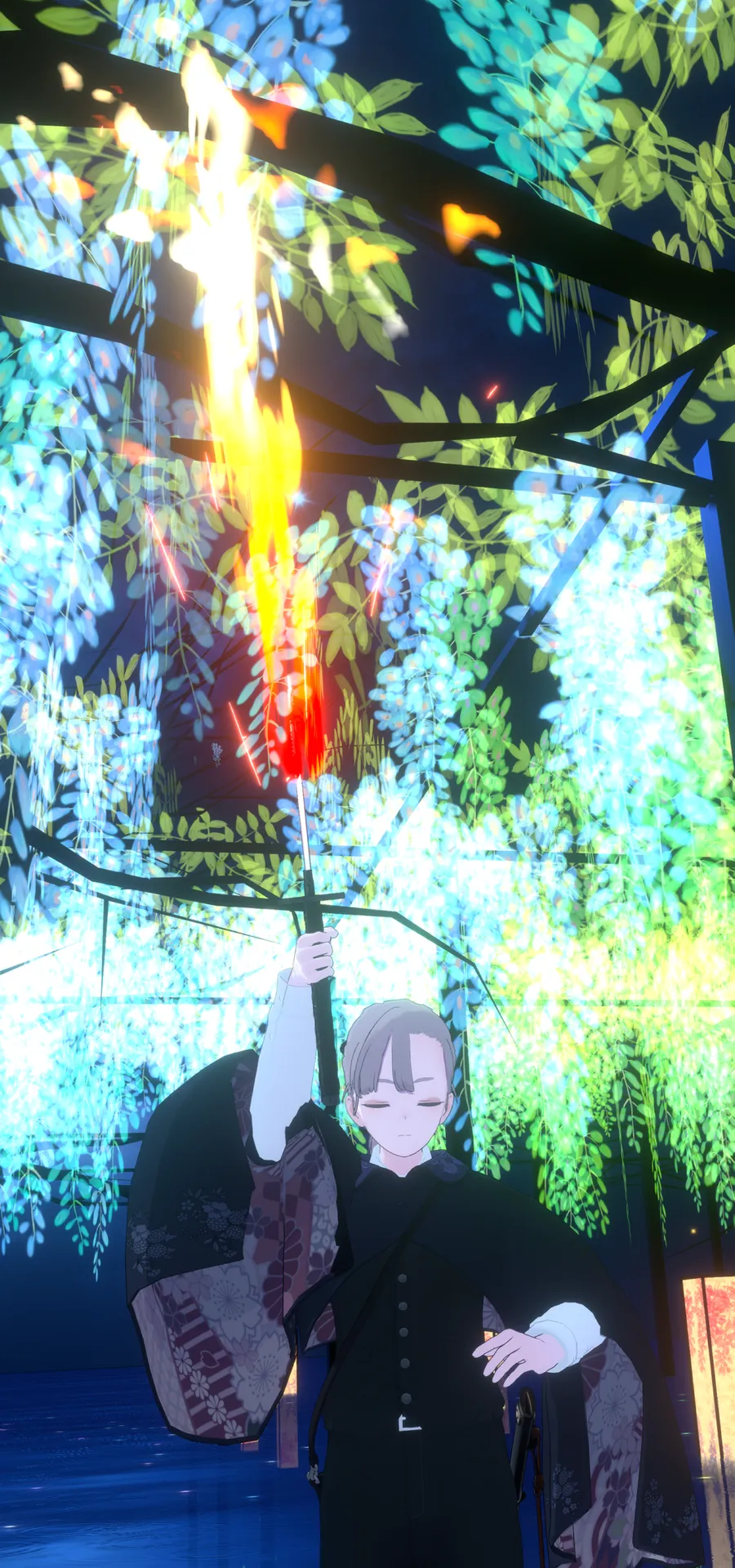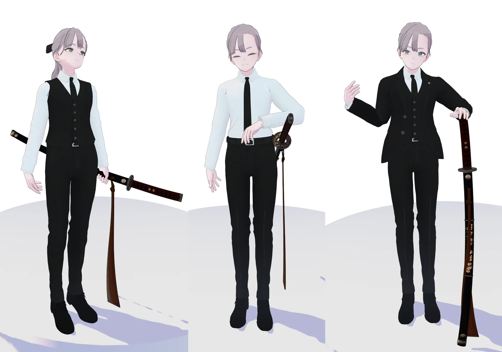 元々の服をベースにスーツに刀を帯びさせて和風にしました。結果的に鬼退治してそうな見た目になりました。刀は一見折れてますが、振ると炎の刀身が現れます。ボレロを外して着替えれるようにもしてます。