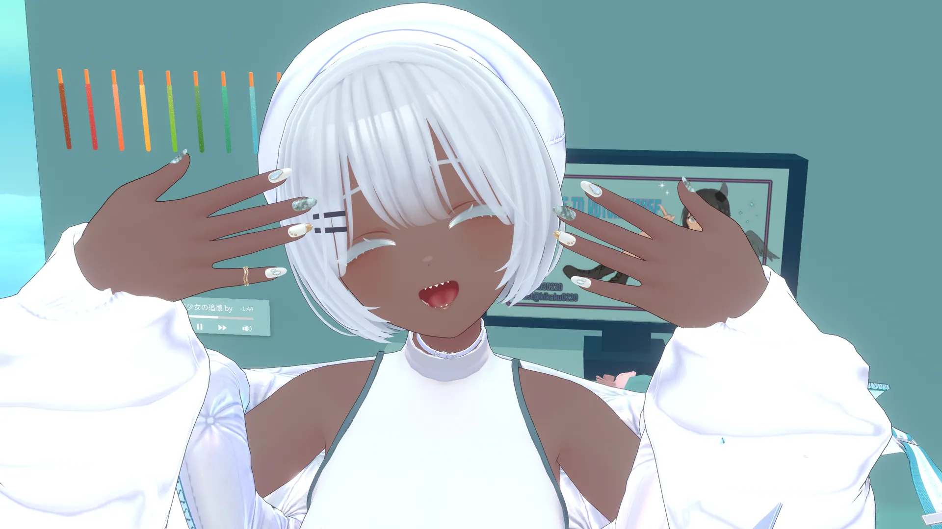 ことねアウターがすごく好みだったので発売まで待ってました!!n改変もめちゃくちゃ楽しい~~~nまっしろな衣装にしたら褐色の方が映えるかと思って改変しました!nまたショートカット似合うなと思って今回の改変用にショートカットもかっちゃいましたnnアバター□https://booth.pm/ja/items/4876459n髪型□https://booth.pm/ja/items/3985412n服□https://booth.pm/ja/items/5244500nキーホルダー□https://booth.pm/ja/items/4781558nネイル□https://booth.pm/ja/items/4979044