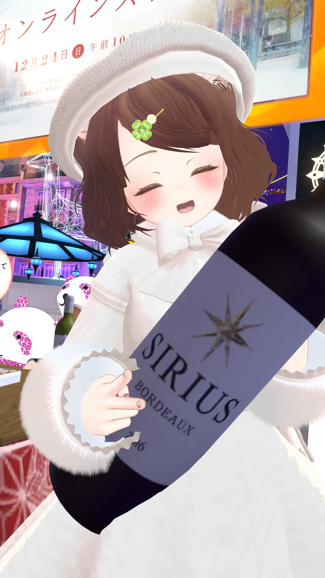 VRCコーデテーマ会~冬~に参加した時のコーデです。n今回は全身真っ白コーデ!nn髪:自作(VRoid製)nクローバーの髪飾り:ワンオフ『おもちやさん』