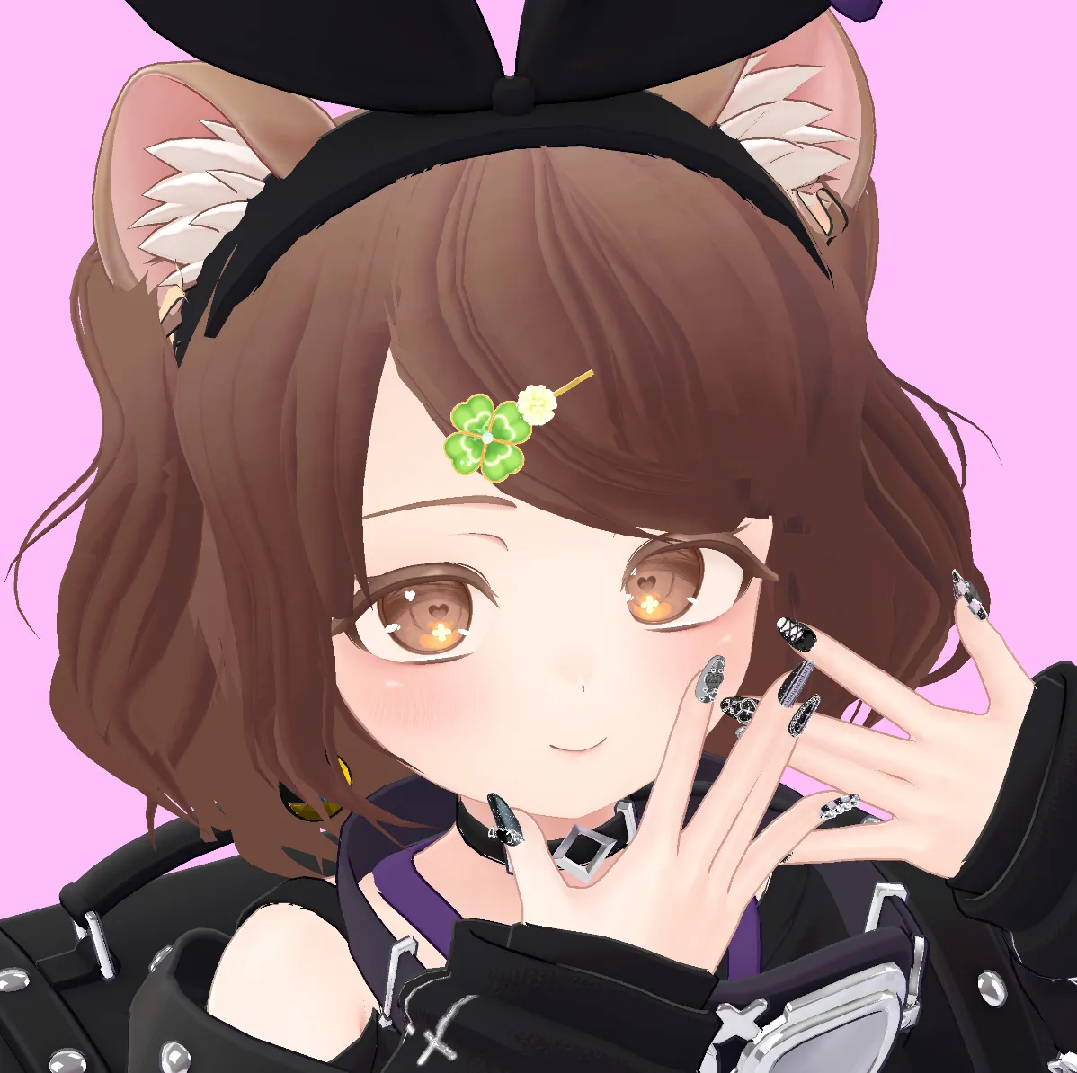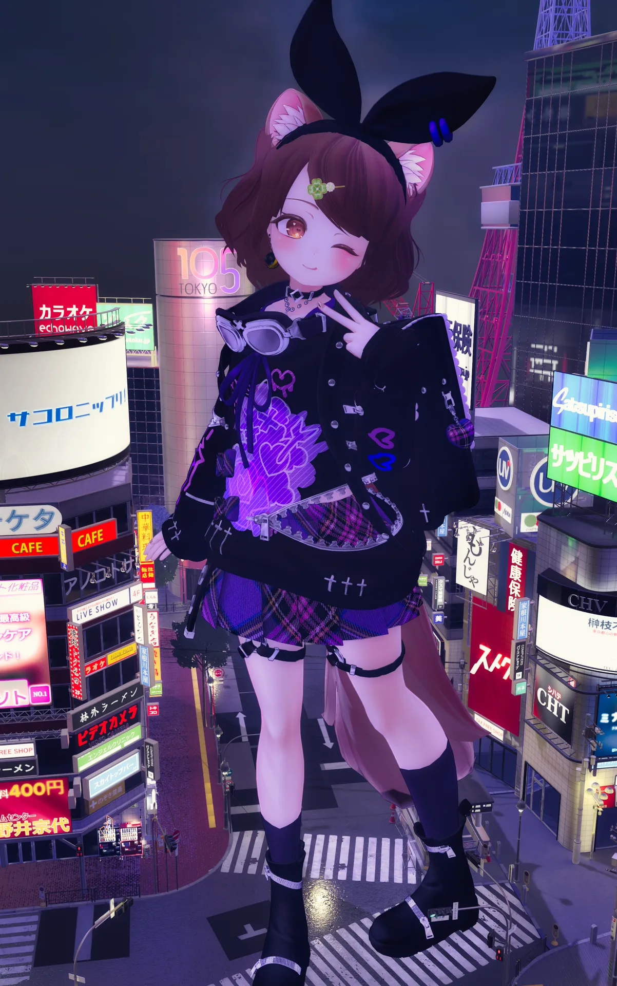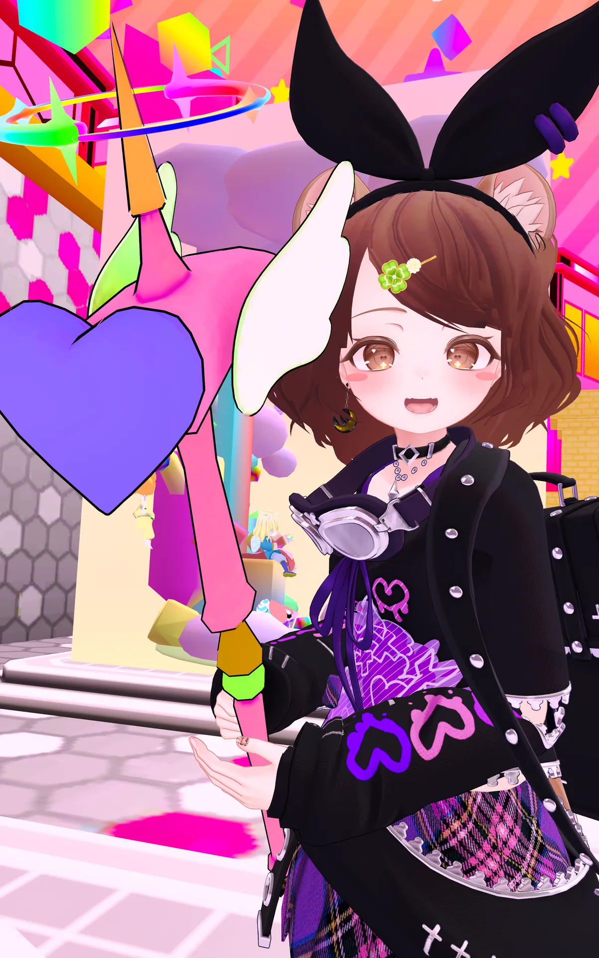 HARAJUKU_VIBEがめちゃ可愛くてお気に入り。n撮影場所もこれに合わせて渋谷と原宿!nn髪:自作(VRoid製)nクローバーの髪飾り:ワンオフ『おもちやさん』n衣装:HARAJUKU_VIBEnネイル:? DEVIL's MANIA! ?