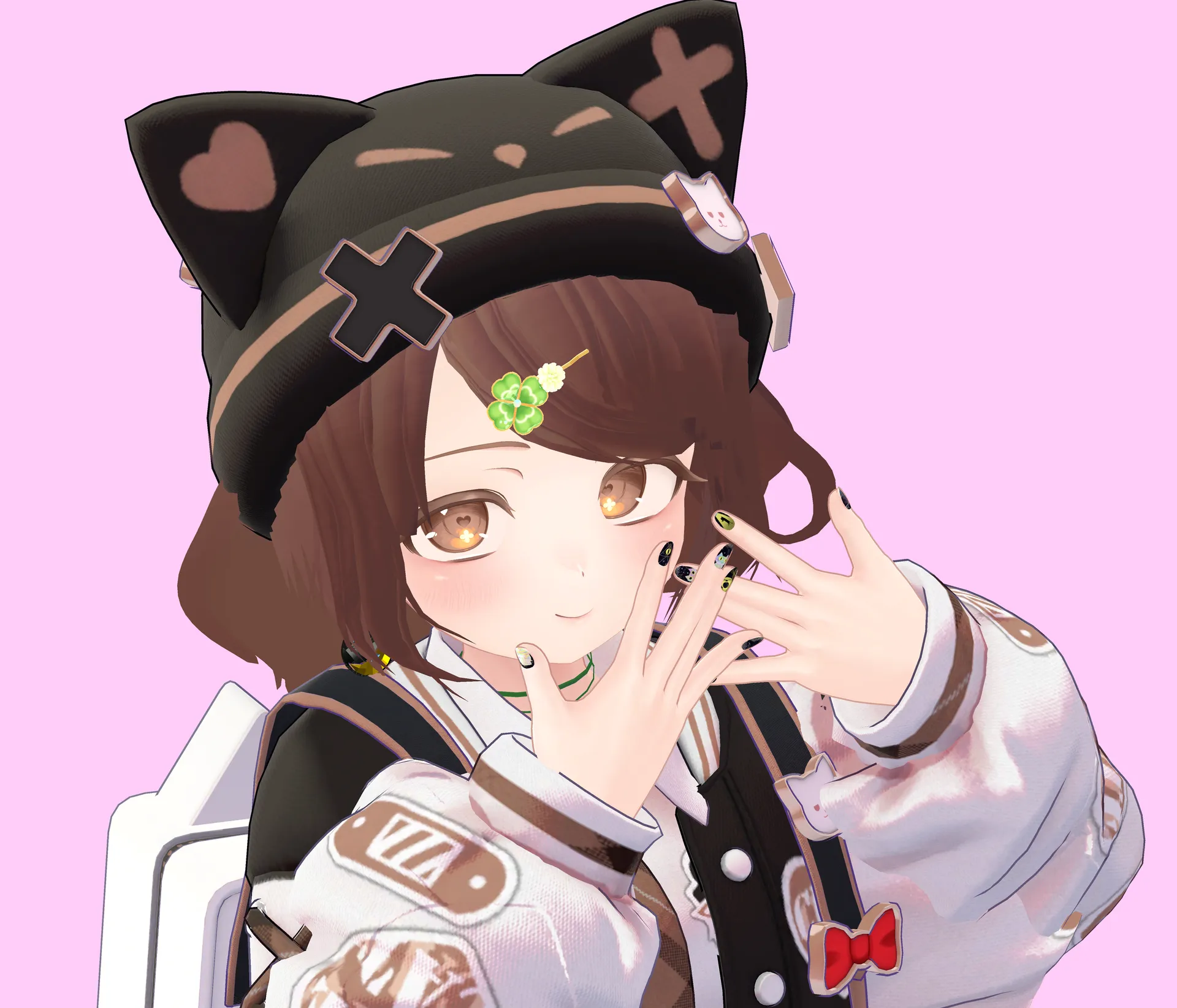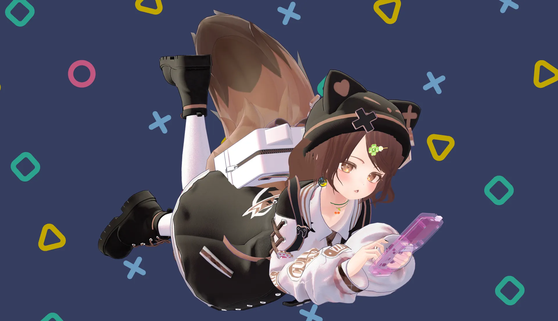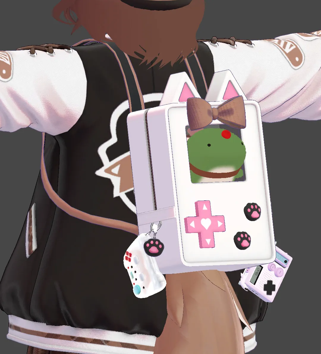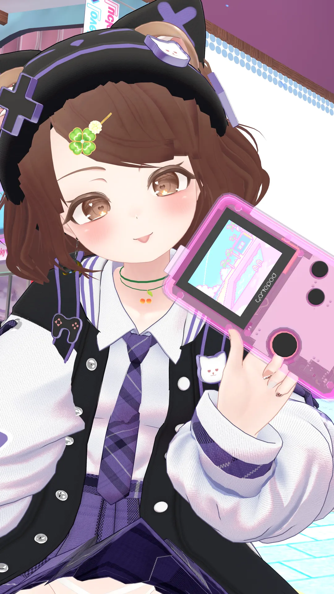 ストラスKITTY BOMBにクリアカラーのGAMEPODを組み合わせたら街に似合うサイコーにゲーム好きな女の子が出来ました??nそしてネイルにもゲーム要素欲しいなーって思って見つけたゲーミング宇宙猫をチョイス??nさらに背中のバッグに好きなものをたくさん詰め込みました!nn髪:自作(VRoid製)nクローバーの髪飾り:ワンオフ『おもちやさん』n衣装:KITTY BOMBnネイル:宇宙猫ネイル―Galaxy Cat Nails―n小物:GAMEPOD(クリアピンク)、ふわふわのたつ、キュートなピンクのラジオ、コントローラー N-301XXA