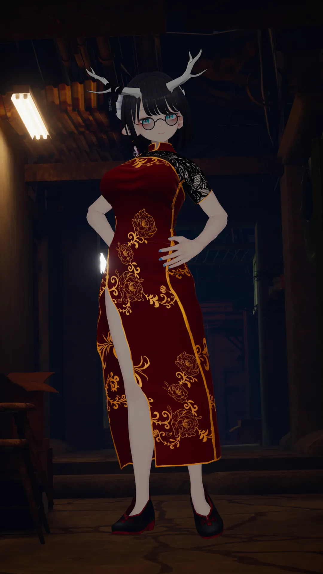 龍のヨルちゃんチャイナ改変です。n大胆なスリットとシースルーがいいね。nnチャイナ服:【くろなつ用衣装】チャイナドレスn髪:ピュアボブヘアーPureBobn靴:VRoidnシニヨンキャップ:リーファちゃんnピアス:Fusion Sukajann