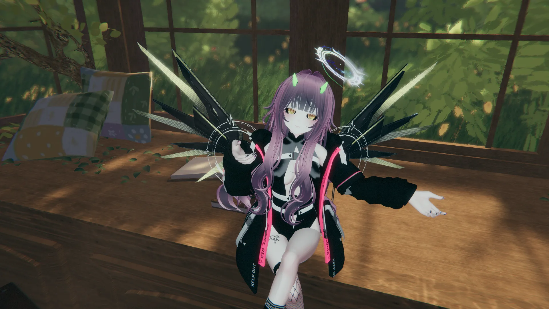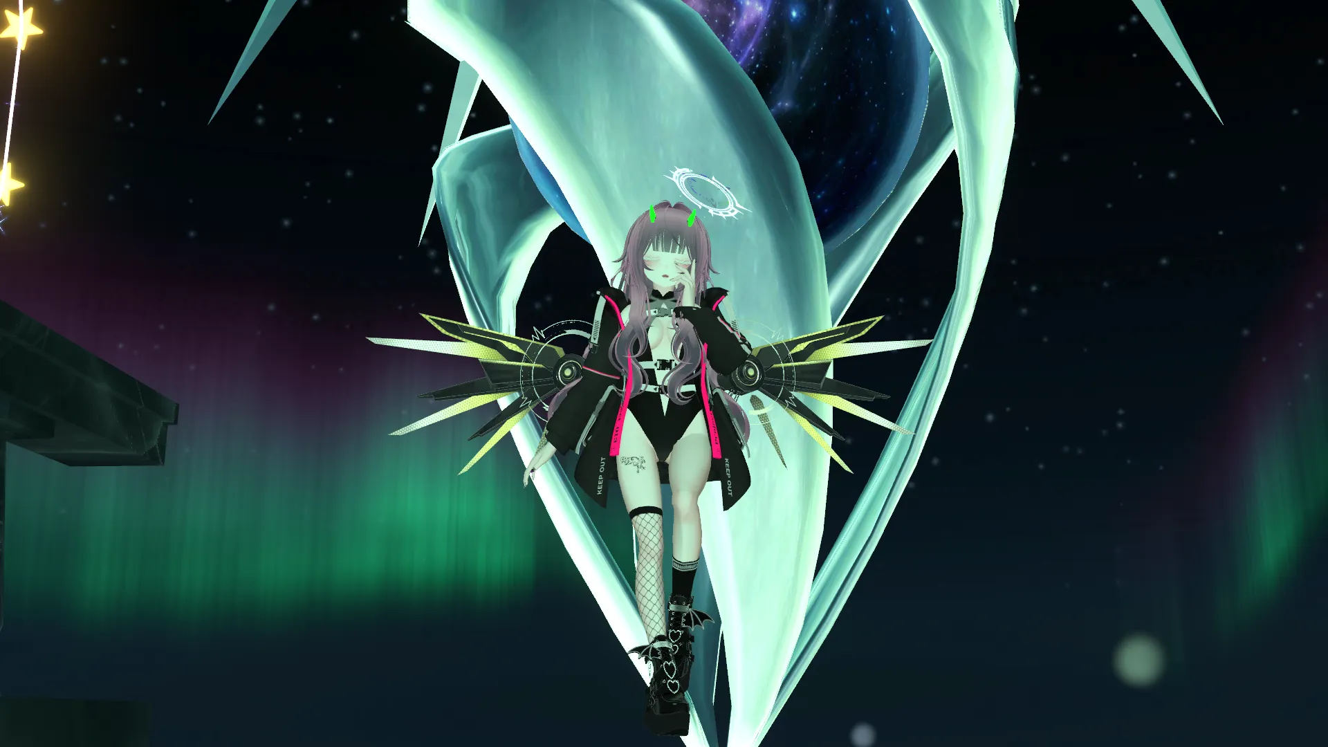サイバーパンクをテーマに改変してみました??n人外らしさを出すために、アイテクスチャやヘイロー、機械翼を取り入れました!nアクセやネイル、シューズはてんぱすおおもりさんの「DEVIL's MANIA!」を組み合わせています!nn発光テクスチャで暗いワールドでも綺麗に目立つことができます!nかっこいいワールドでの写真がとても映えるのでオススメです???nnHeadはリーファちゃん、Bodyには桔梗ちゃんを使用しています!nn