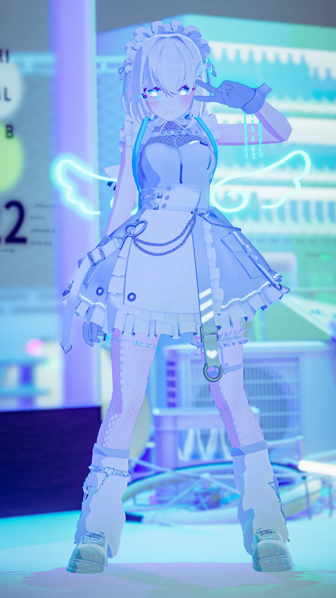 フォトコン用に作成した改変でした??n電脳系メイドがテーマだったので、好きな白水色配色で天使っぽさを出しています???n実は靴や後ろの猫バッグのヘイローに発光やサイバーなテクスチャを適用させています…!けど見えにくい…!