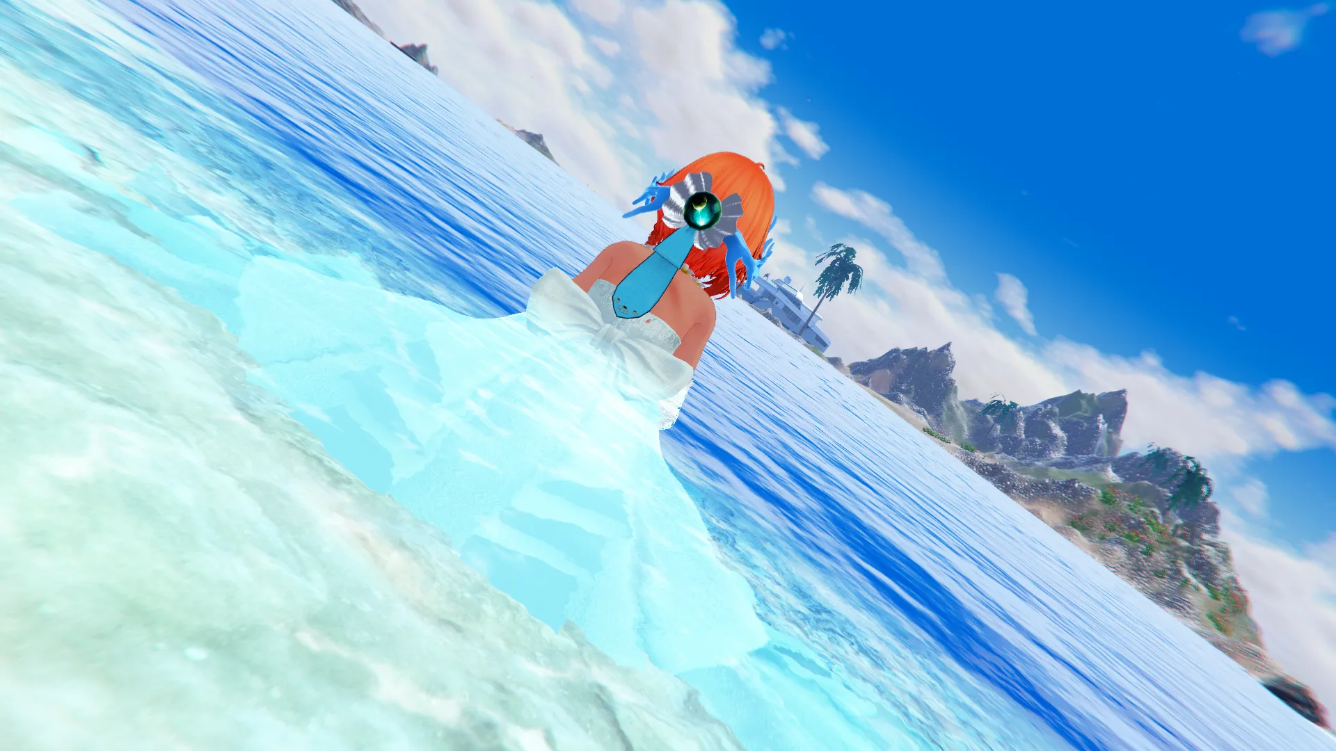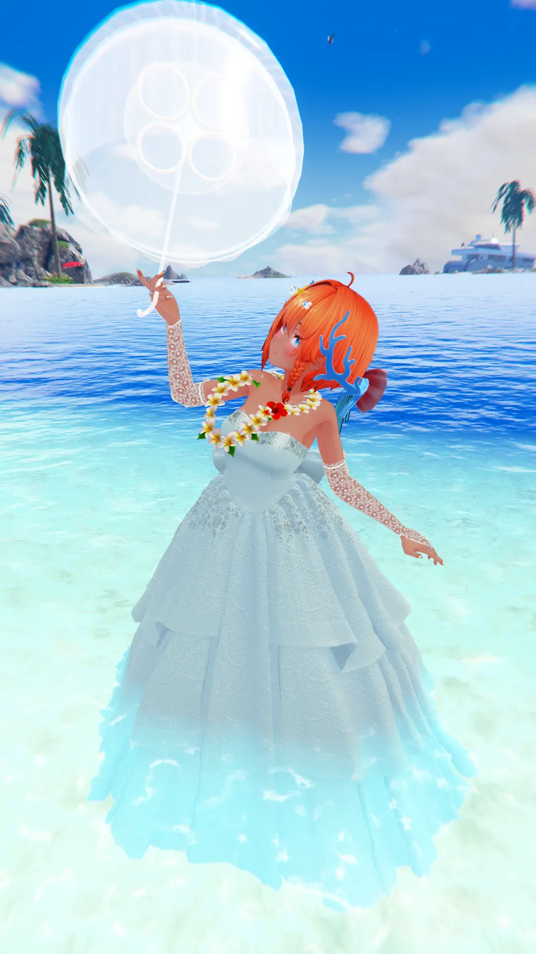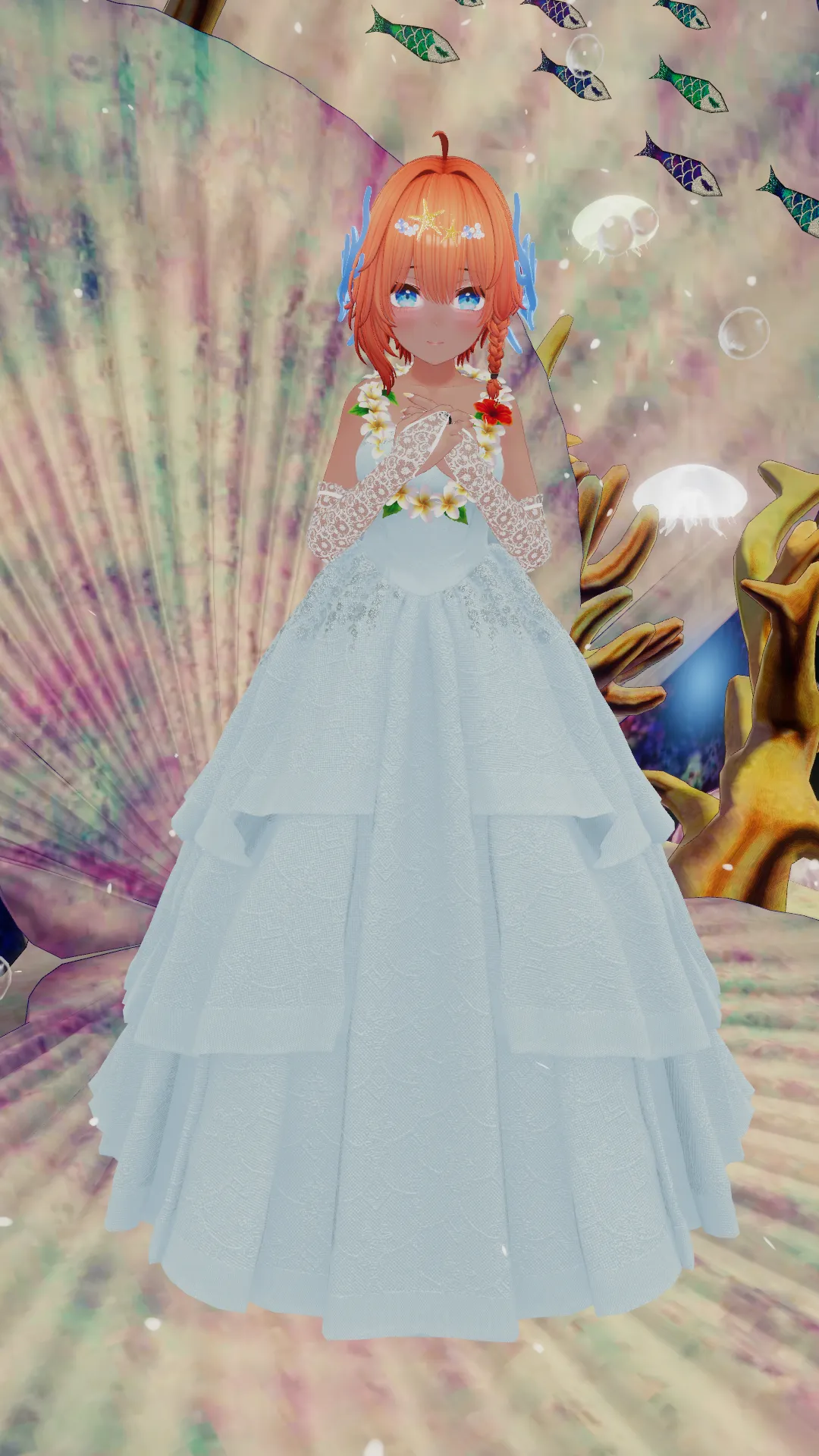 KaolinitePavillonさまのWedding Dress(水色)とバーチャル沖縄さまのフラワーレイを中心に、「人魚の国の王子に嫁ぐ南国の姫」のコンセプトでマリンテイストのブライダル改変をしました。n スキンテクスチャはドレスで視線が集まるデコルテのハイライトが綺麗な「コスメセット」のtanを採用し、アイテクスチャは「海」、敢えて浮かせたメイクテクスチャは砂浜を思わせる「Maji gyaru makeup」を合わせました。n ウェディングベールやティアラの代わりに、ヒトデの髪飾りと珊瑚のヘッドドレスで花婿から貰ったアクセサリーを表現、更にエスコート役のクラゲを模したパラソルでコーディネートコンセプトに沿った表情づけをしています。n これからの季節のビーチ撮影にもぴったりなサマーブライダルコーディネートになったと思います。n Pavillonさまのファーストアパレルがウェディングドレスだったので非常にときめきながら作った改変です。この一件の改変に留めておくだけでは勿体無い丁寧な作りなので、コンセプトやカラーを変えて今後も作っていきたいです。nn撮影場所:Home of the Islands、nケセドの誕生-THE BIRTH of CHESEDnフレンドさんが撮影してくださり、お写真を提供していただきました。n2024年6月8日完成(改変no.10)