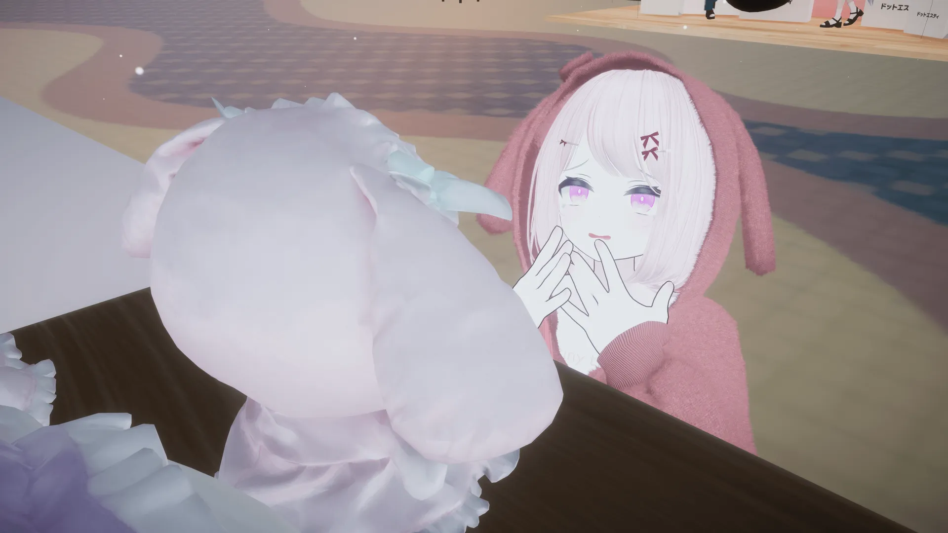 「サンリオVfes2024」合わせコーデ。「tiny tiny×マイメロディコラボ」を着用。n思いっきりピンク色にしたホノカちゃんを以前からちょくちょく使っているので、わかりやすいあざとさ担当を彼女に担ってもらうことにしたわけです。リアクロ要素はあるので、髪のMERORIBBONは忍ばせる程度に。nぴえん顔がほんとに「ぴえん」みがあってよさげ。推しの前で限界になるタイプの子。