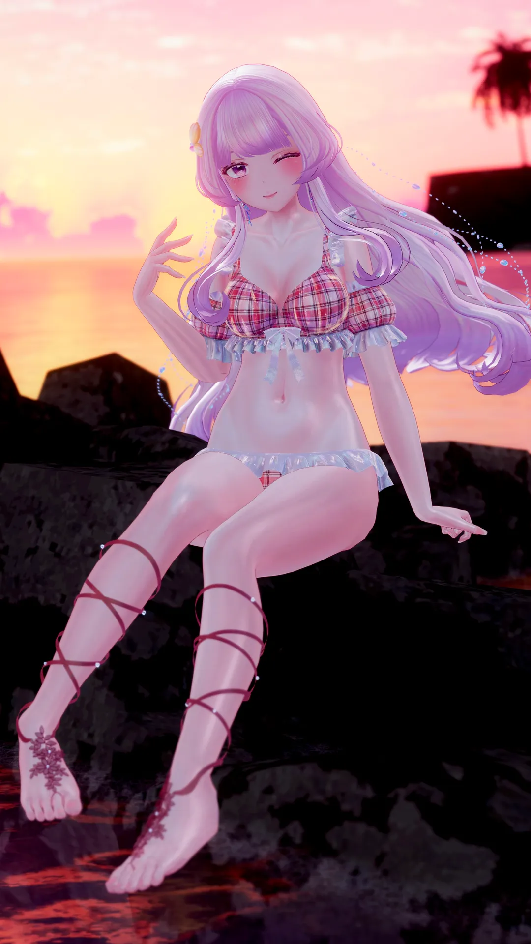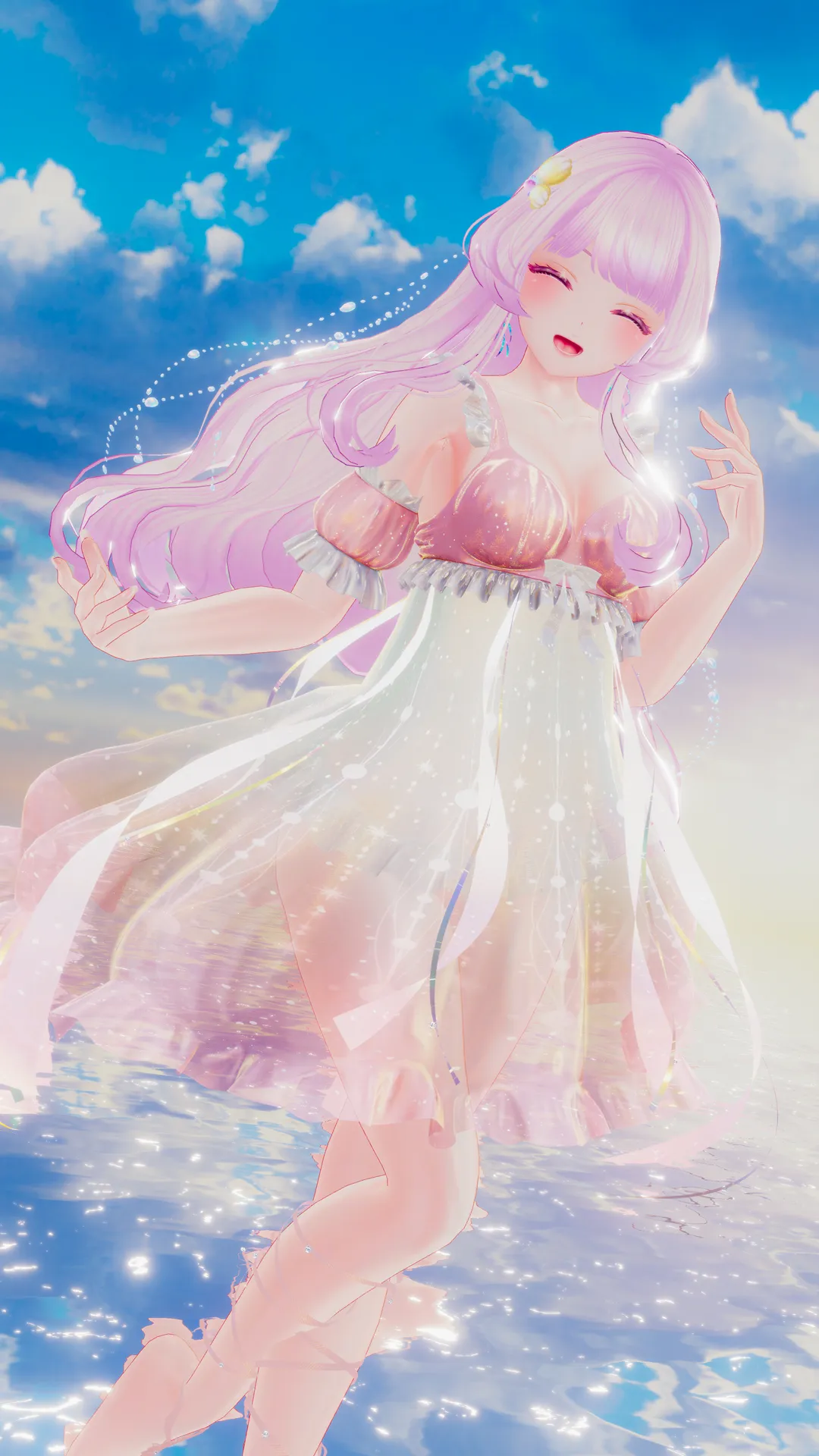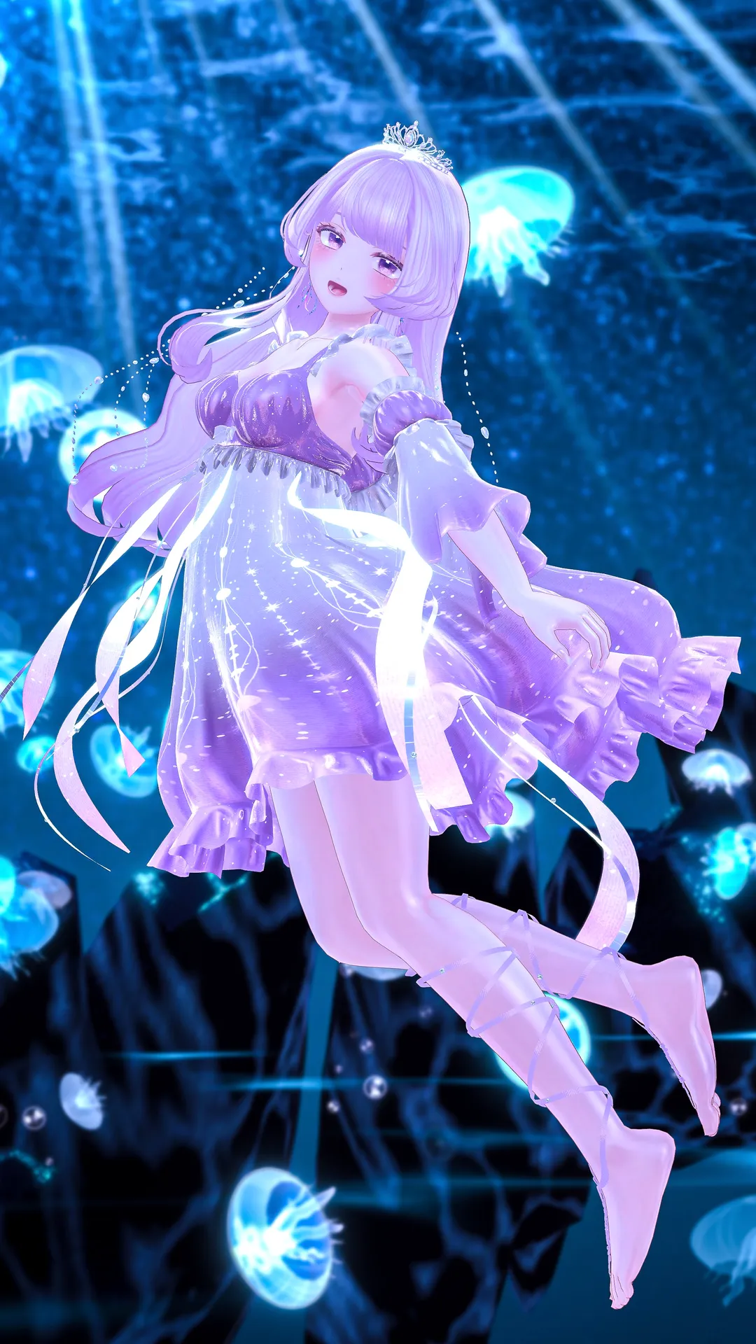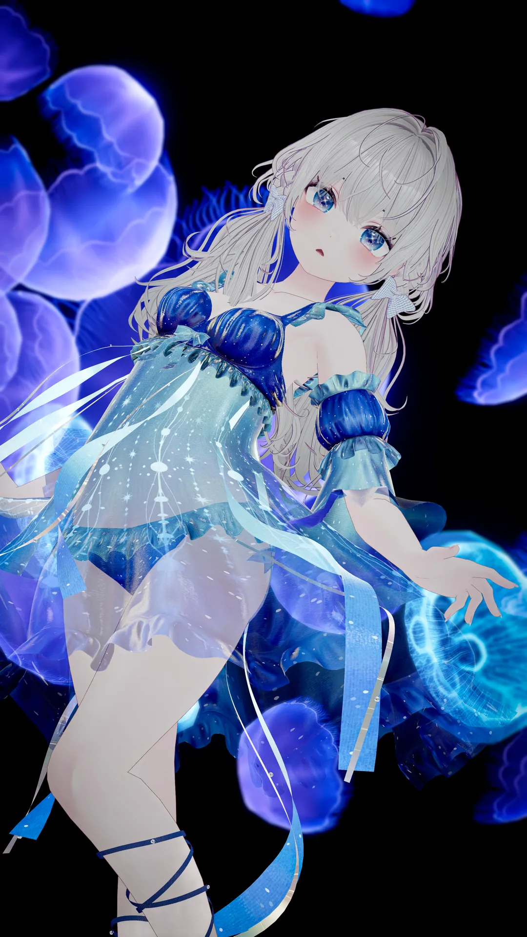 かみやのしっぽ暗がりで光るふわふわのクラゲドレス????nふわふわなレース部分は暗い所だと光るのと、マテリアルチェンジによって透けててまさにクラゲ、、、!!nn外しても、ビキニになってかわいいです!nn今回、クラゲのお姫様のコンセプトにして撮りたい!と思い髪型は「姫さまのおぐし」っていう解釈一致な髪型にしてみましたn海系のアイテム、特にパールが欲しかったので別の髪型のパールをblenderで移植してみましたn貝殻とティアラも付けてもりもりお姫様気分です??nn水着部分の質感がめちゃくちゃに良くて、、、UnityでもVRChatで撮っても生地のツヤ感が綺麗だったので撮影捗りすぎました