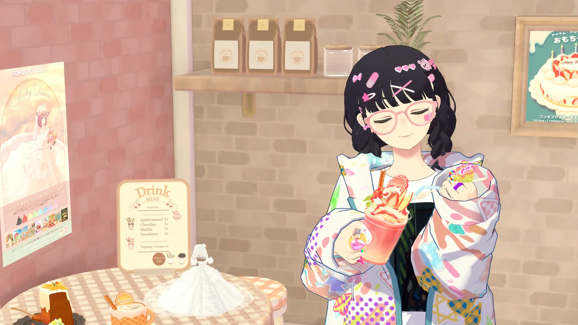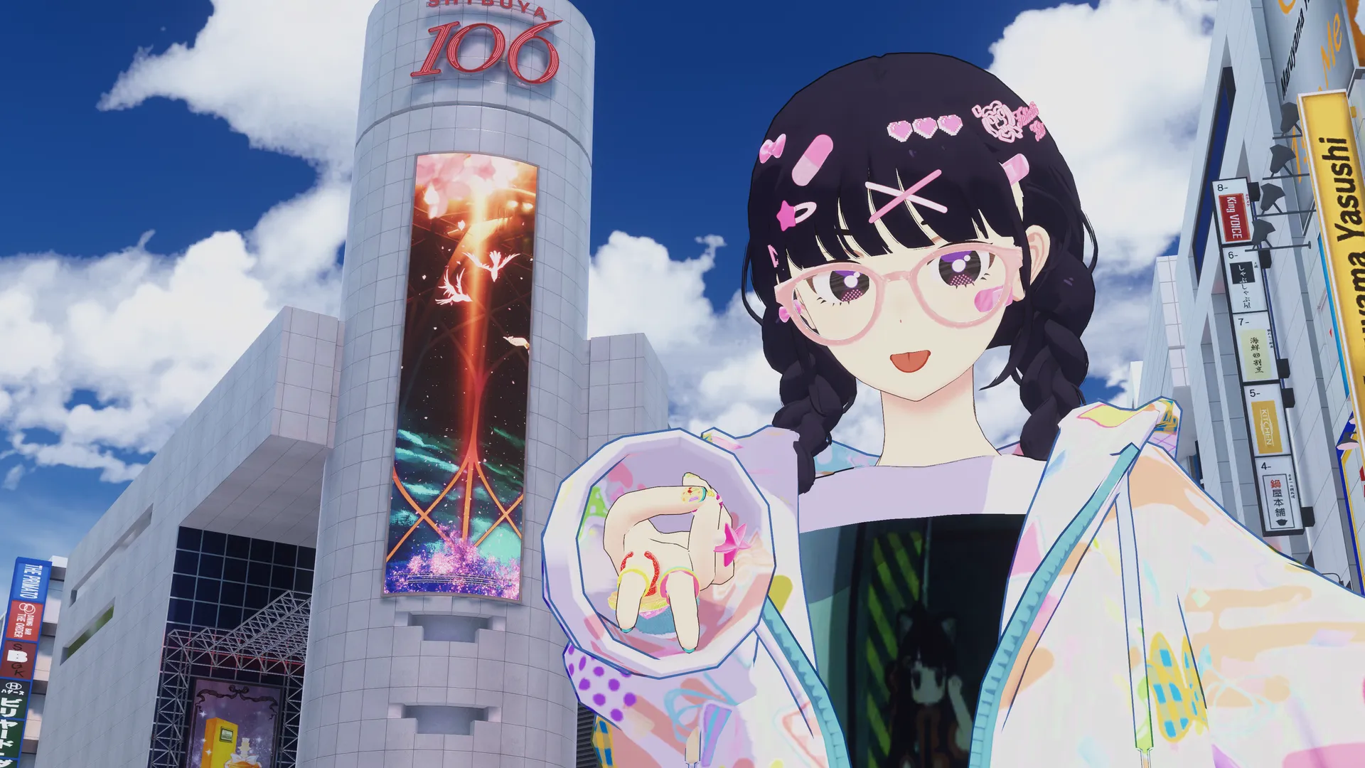 ことねオリジナルを見たときにオレンジレンジとかの歌詞をキャンパスノートの表紙にポスカで書いたりnデコメに全力注いだりしたJK時代を思い出したりなどしてちょっと昔のJKをイメージした改変をしました!nミニモニとかたまごっちとかそういうの好きそうっていう発想からカラフルにしてます。nそういった改変に大変お役立ちしたのが、Minuet_Dollさんの指輪セットでした、n基本テクスチャを色改変してしまいますが最高なカラフル具合でなにもせずに使わせていただきましたチョベリグです。nnPOPなイラスト調なので、髪型はGrus対応のみつあみを合わせました。nさすがにunityだけだとかなり不自然だった為なくなくblenderに持ち込んであわせています。nnアバター□https://suzuri.jp/surisurikun/digital_products/53046nヘアアクセ□https://booth.pm/ja/items/3745134n髪型□https://booth.pm/ja/items/3251490n眼鏡□https://www.fanbox.cc/@minuetdoll/posts/7724771n髪型□https://booth.pm/ja/items/5324416n指輪□https://www.fanbox.cc/@minuetdoll/posts/8040294nカバン□https://www.fanbox.cc/@minuetdoll/posts/8192438