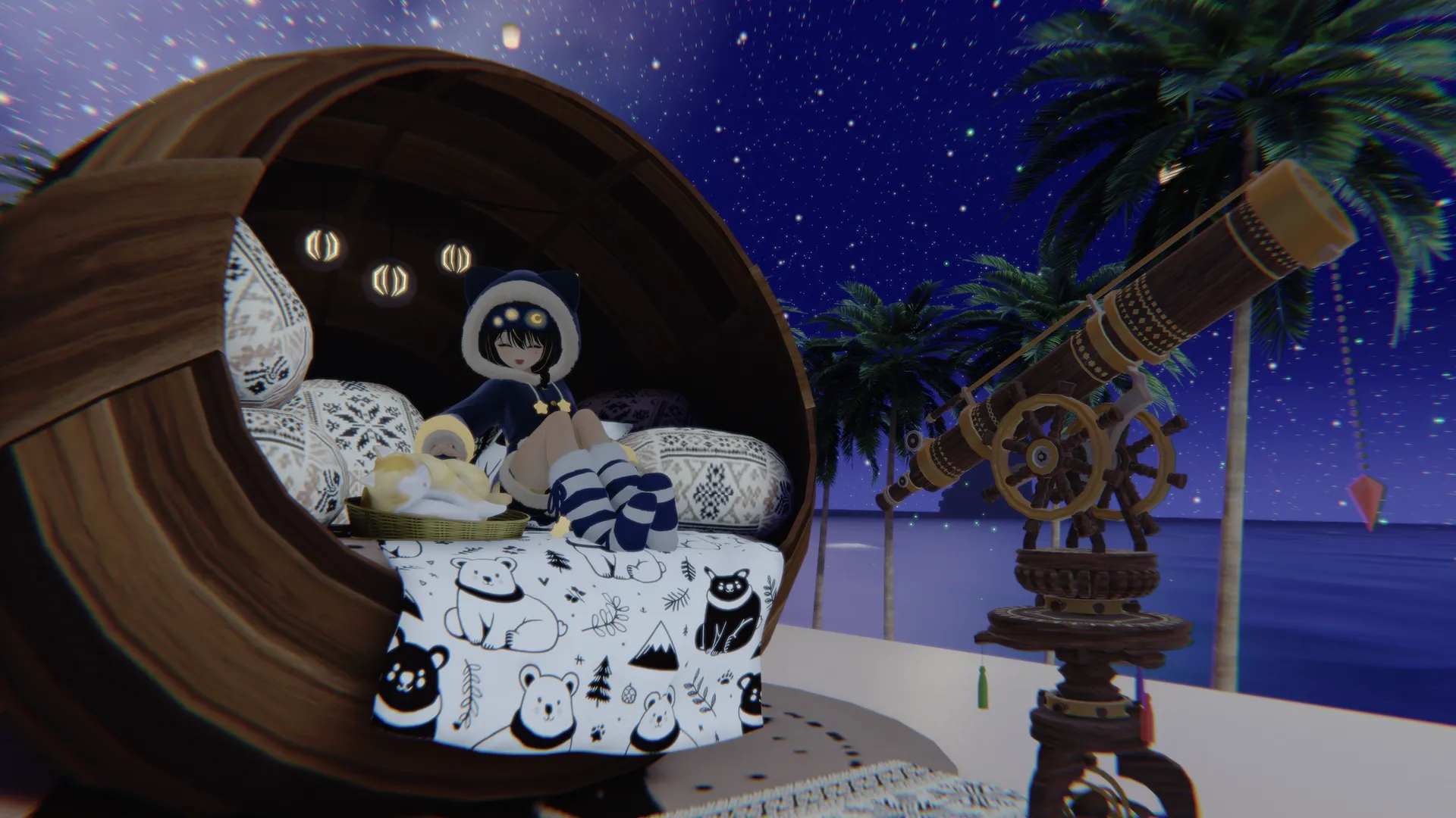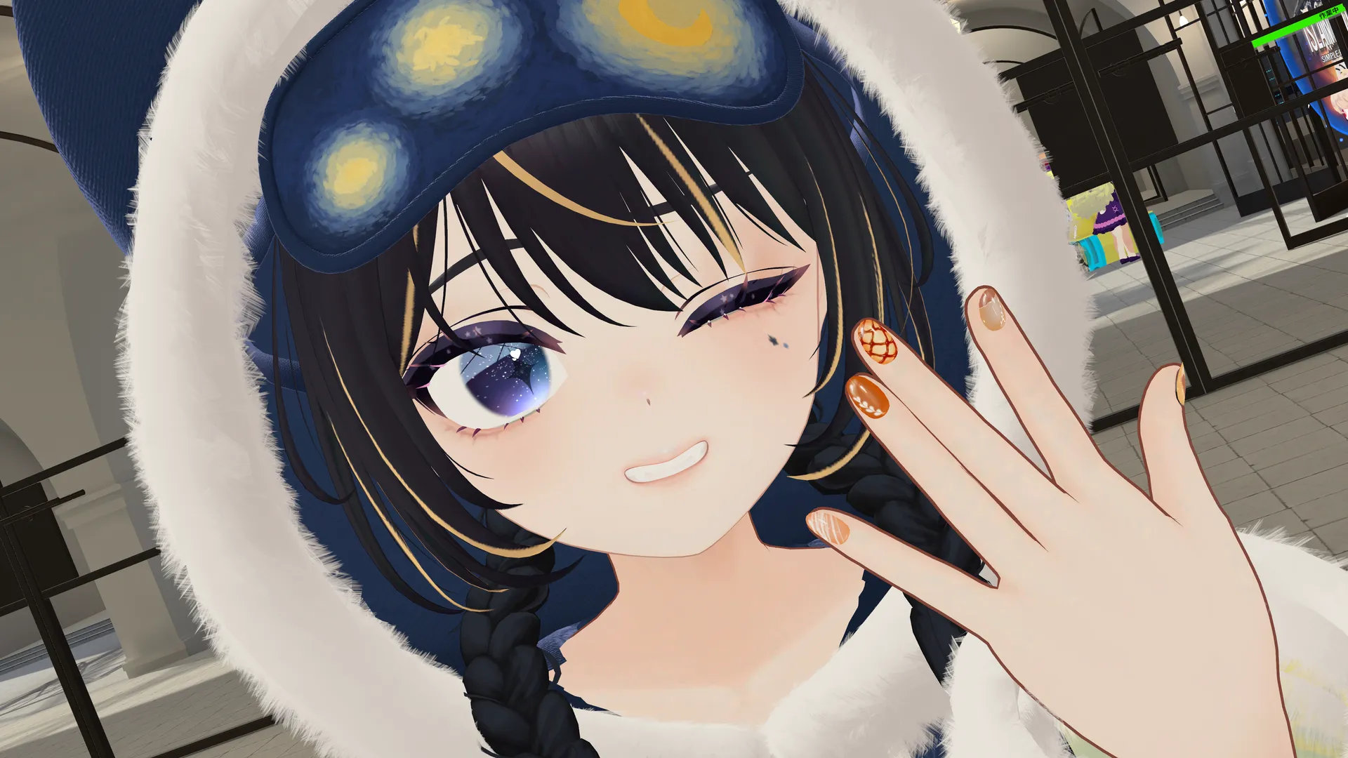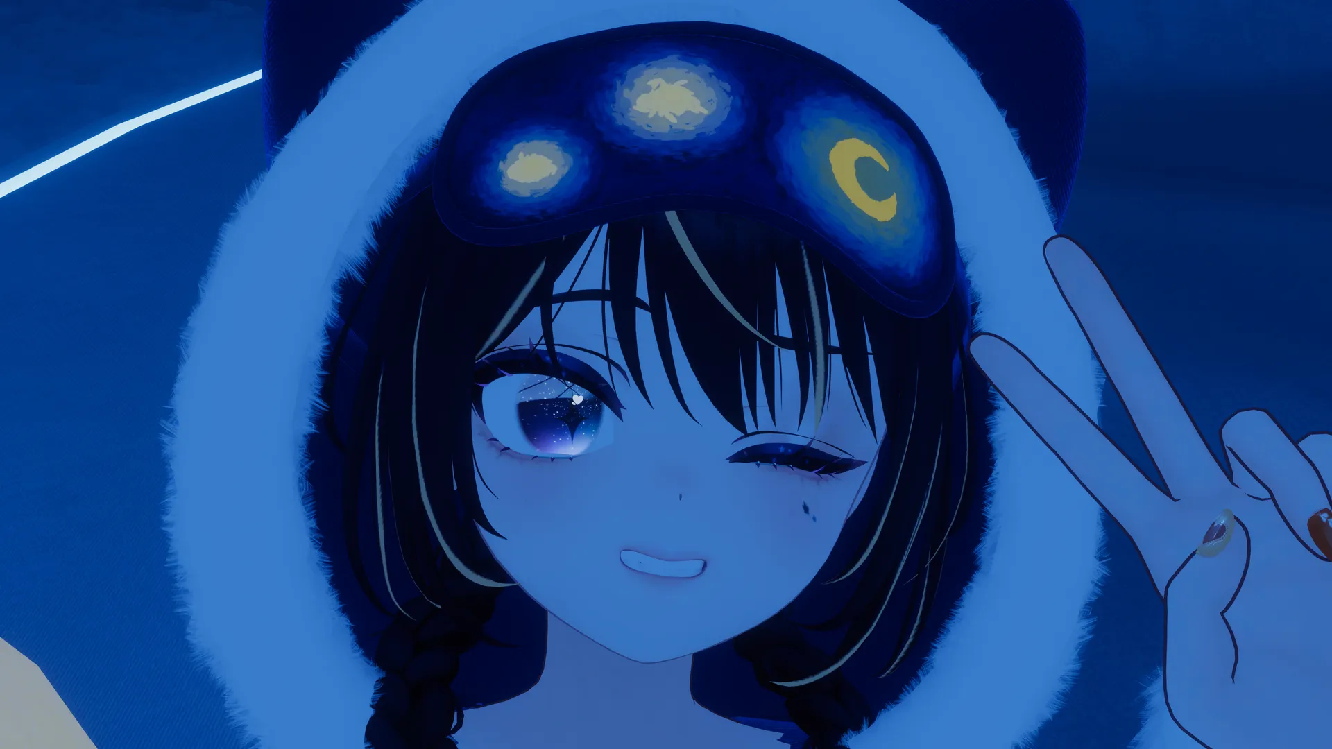 ことねV WORLD様より提供を受けています。nV睡星月夜 -Starry Night-【V睡用衣装】nhttps://vworld.booth.pm/items/6084353nnふわふわもこもここれからの季節にも、n普段のVRCにもめちゃくちゃ使いやすいルームウェア衣装を改変させて頂きました?n衣装の名前の通りV睡用と書かれているので暗いワールドに行くのがぴったりだと思ったのでぼんやり月が浮かぶようにn発光用MASKを作りぼんやり光るように改変してます!nソックスのクシュクシュ具合と揺れる星が超かわいいですnnまたおちゃかなしょっぷさんのアイテクスチャ、Classy Night Eyeが似合うだろうな~と思い合わせていますn星空が目の中に入っていて綺麗なのでおすすめです???nnフードがもこもこなので三つ編みとか二つくくりで前に出してあげると可愛いですよ!nnアバター□https://booth.pm/ja/items/5058077nアイテクスチャ□https://escapefroma.booth.pm/items/5347009nメイク□https://booth.pm/ja/items/5769383n髪型 前髪□https://booth.pm/ja/items/5503436n髪型 後髪□https://booth.pm/ja/items/4667339nルームウェア□https://booth.pm/ja/items/6084353nネイル□https://omochi-mochishop.booth.pm/items/3250503
