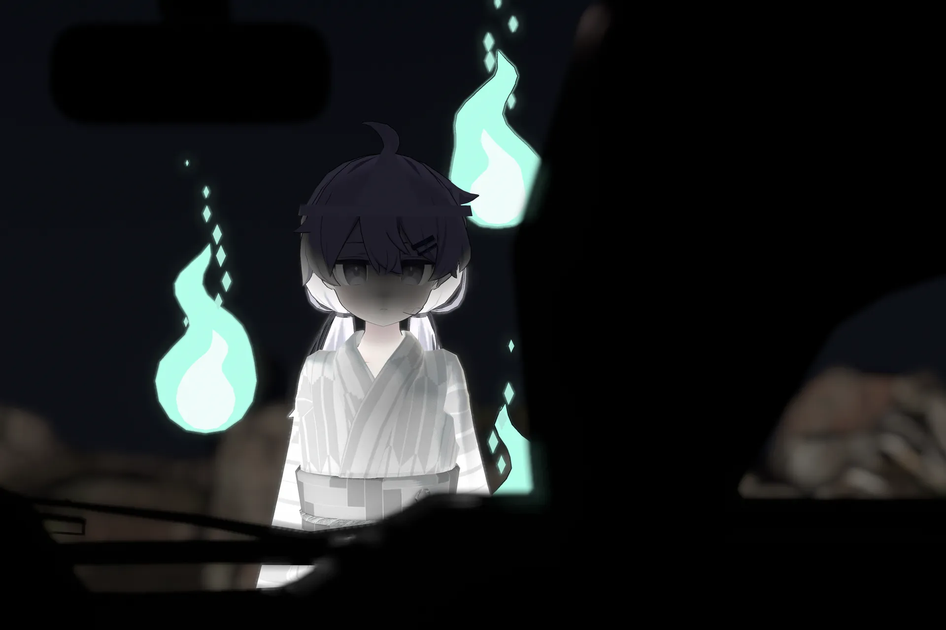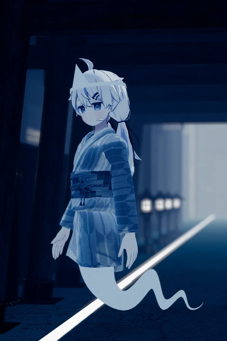 幽霊のプラチナちゃんです。n幽霊っぽさを演出するために和服を着せました。n左右の鬼火はONOFF可能にしています。n三点トラッキングでも簡単に写真を撮れるようになっています!nアバター:プラチナ(ぷらすわん)n服:浴衣 2023(monoTone)n足?,頭巾:子孫に会いに行こう!おばけセット(ShagunaTheStoreω)n鬼火:鬼火3Dモデル(雨草屋)