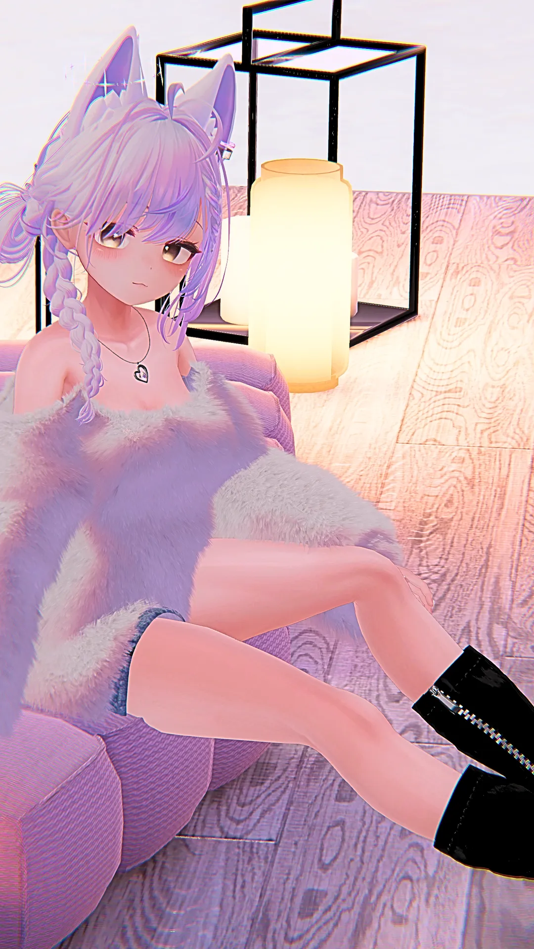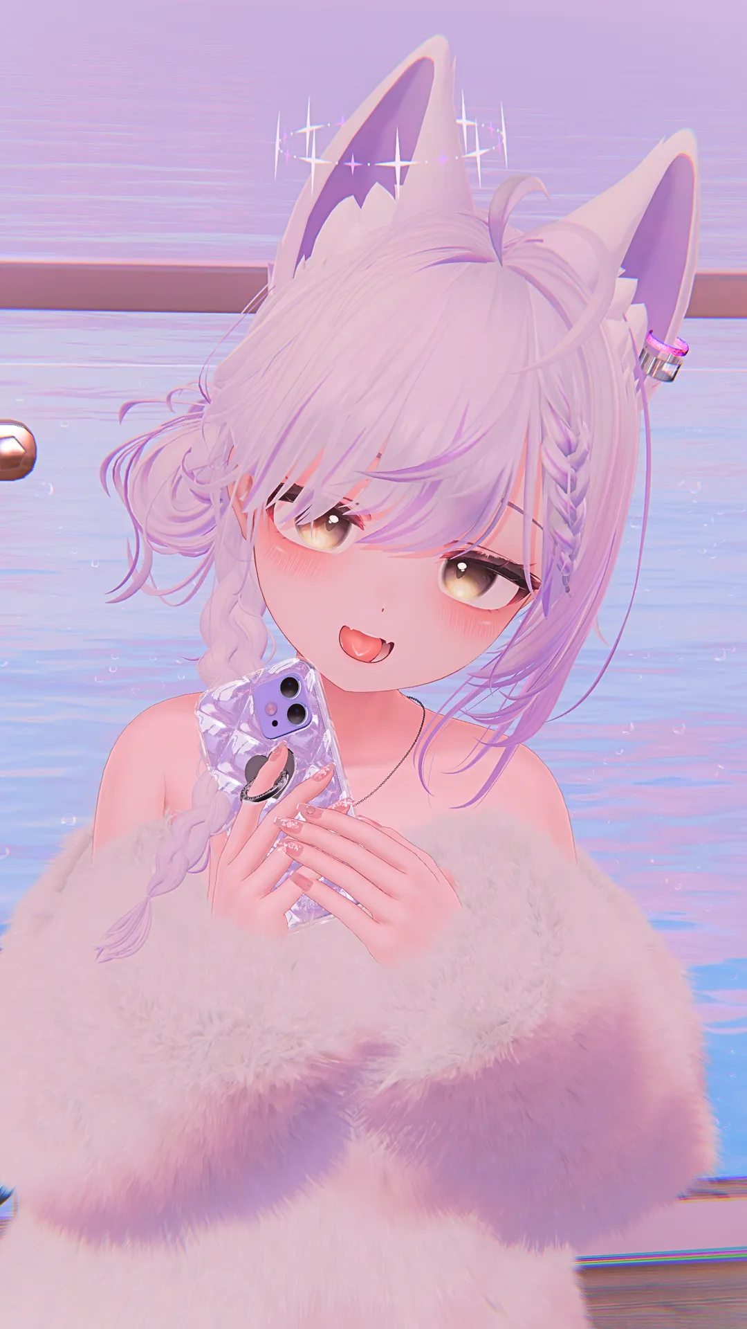マヌカちゃんベースで耳はカリンちゃんn大きなバンヘアと三つ編みにもこもこ服で可愛らしさを表現nトップスはファーの影がきれいに出るように影設定していますn主張しすぎないナチュラルネイルもお気に入り