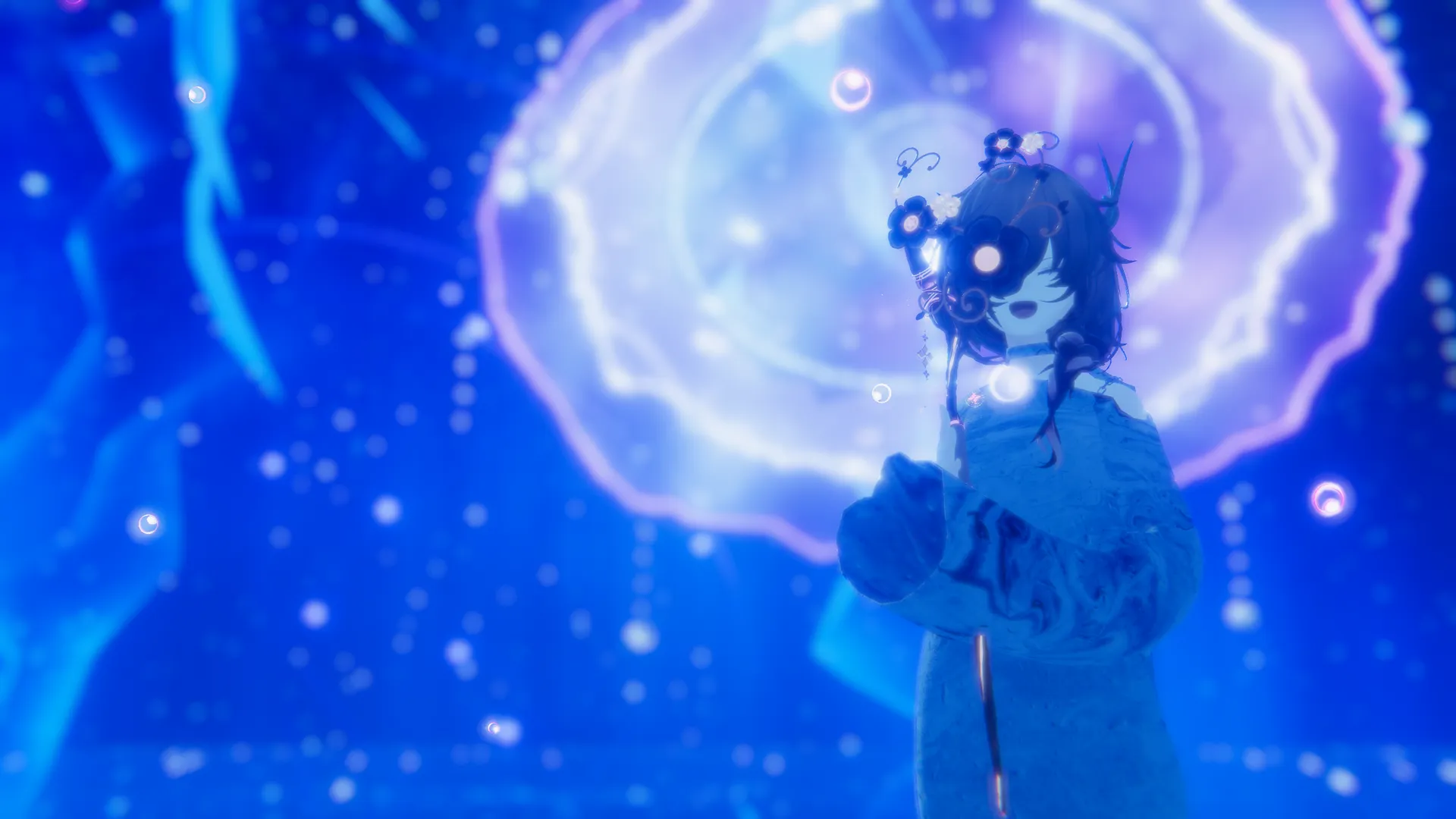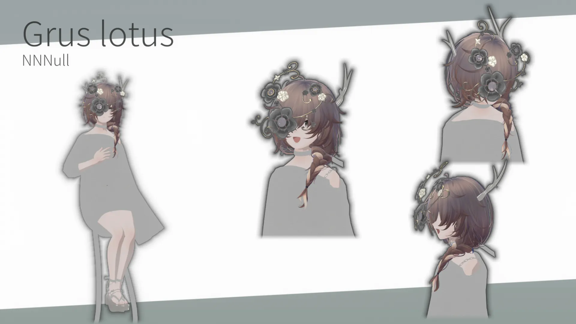 Grusちゃんをベースに、不老長寿な子イメージで練りました。n尻尾とかもつけていたのですが、シンプルなのに落ち着きました。n一番気に入っているところは、もちろんお顔のお花です。nnGrus【久】n├ genten. Full Clothing Set for Grus【ヒツジ電機】n└ ダウナーみつあみ【3Dヘアモデル】【RcoC】n ├ 【VRchat】FlowerObjet【FLURE.】n └ [Grus 用] Crimson makeup texture【MEOW】