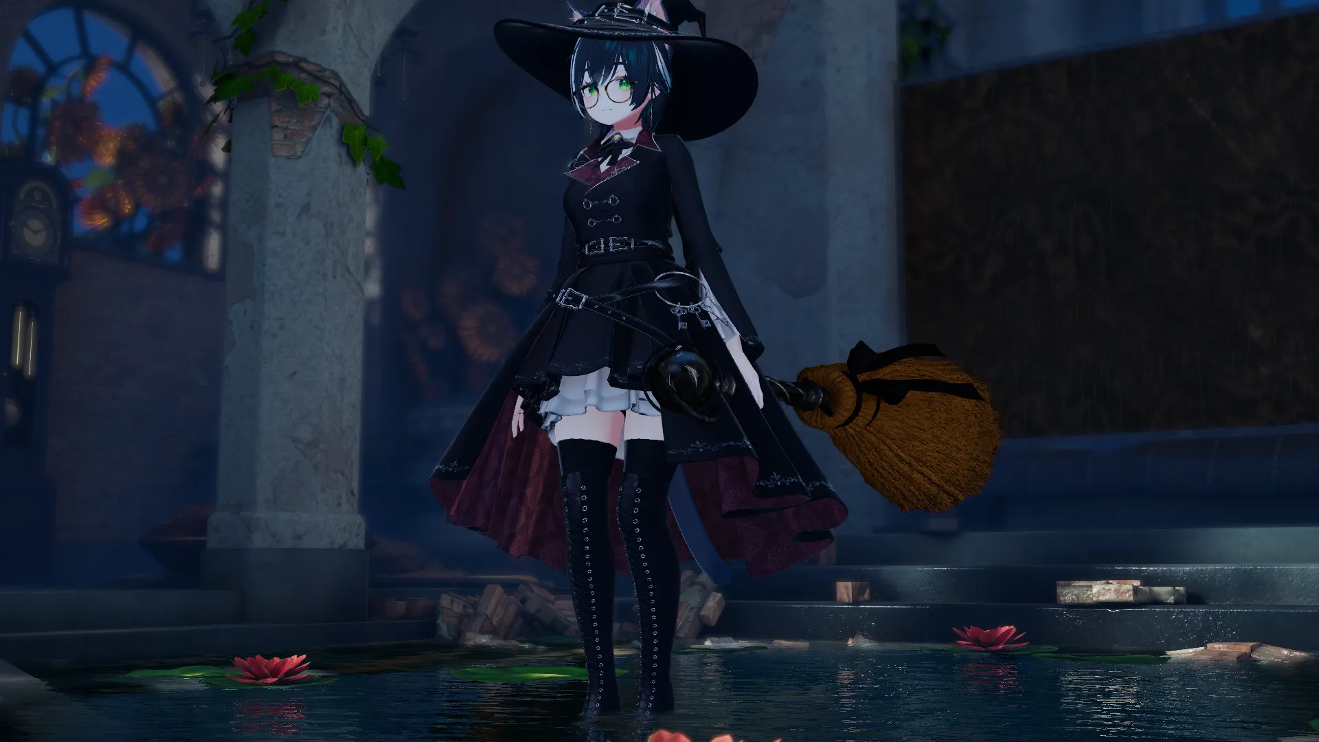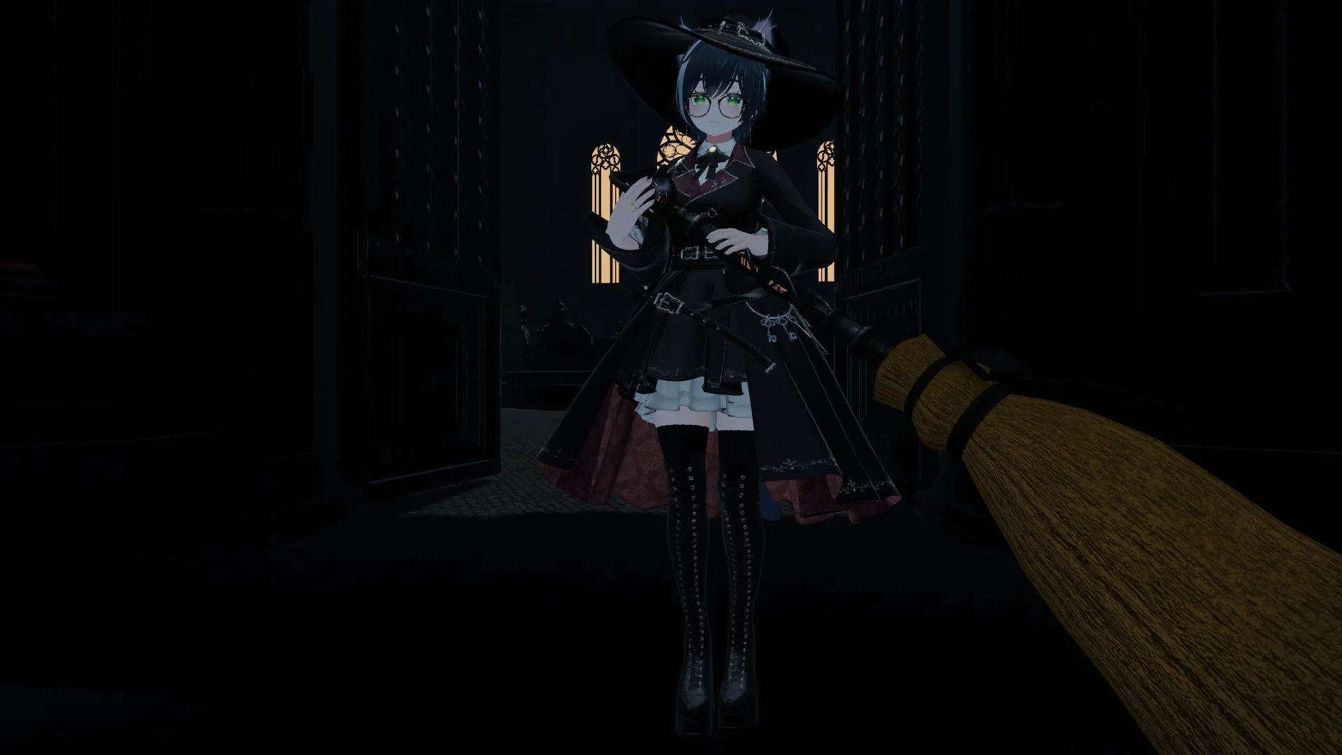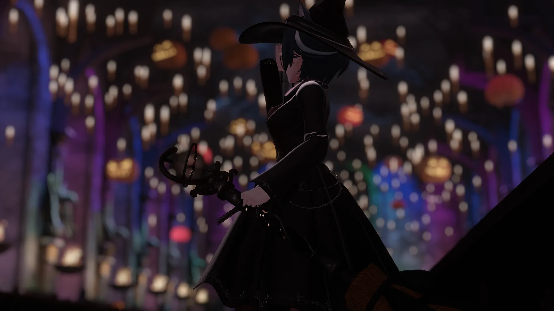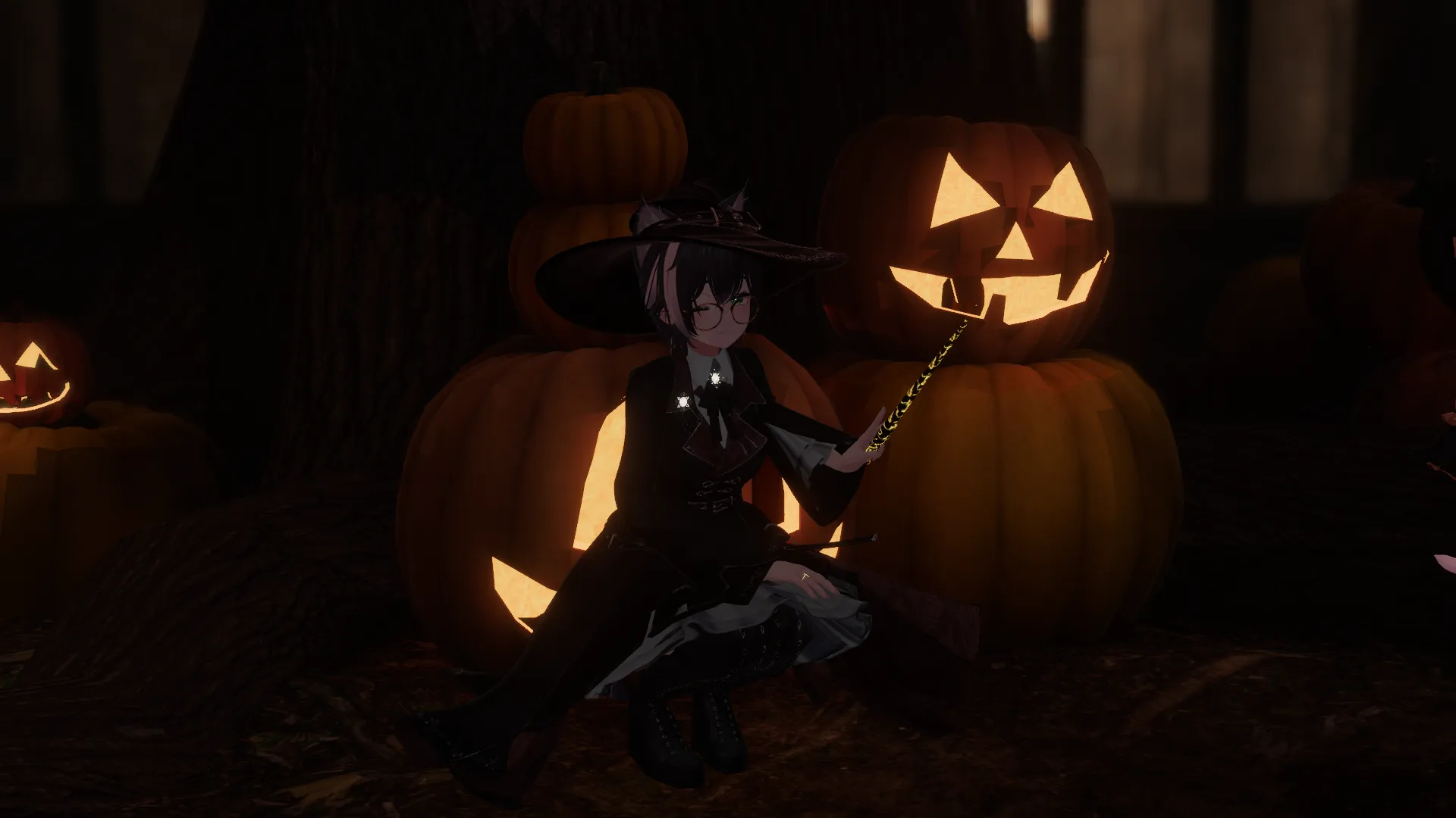 Arcane AttireにMagic Broomを組み合わせて空を飛ぶ魔女になりました。nハットギミックをいれて帽子からハロウィンのお菓子を取り出せるので、出会ったら「トリックオアトリート」と声をかけてね!