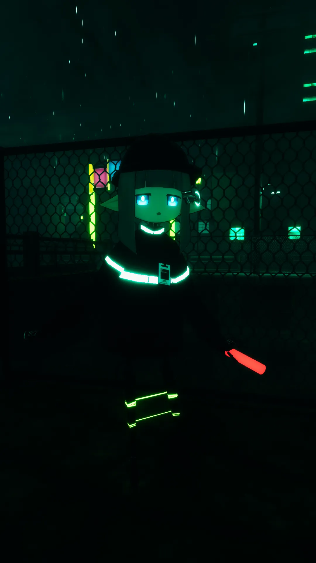 らいてい初改変です。nストリートで若干サイバーパンクな感じを目指した労働に生きるてっさくちゃんです。写真3枚目がおそらく労働中の彼女の姿かと思われます。n都市っぽいワールドに似合う色合いに全体をまとめました。nn***nBlenderの練習も兼ねて三連休で制作しました。nジャケットは元服からメッシュ改変、足についてる柵ロープ・巻き付きビニールテープ・頭の注意喚起ステッカー・誘導棒は自作です。とりあえず完成出来てよかったです。nやりたかったこともまだ色々残ってるので今後の課題にしていきたいと思います。絶対かわいいと思って作ったビニールテープがあんま目立たない仕上がりになったのが悔しいポイントですね…。nとりあえず月曜からはこのてっさくちゃんと街を歩きたいと思います。nn