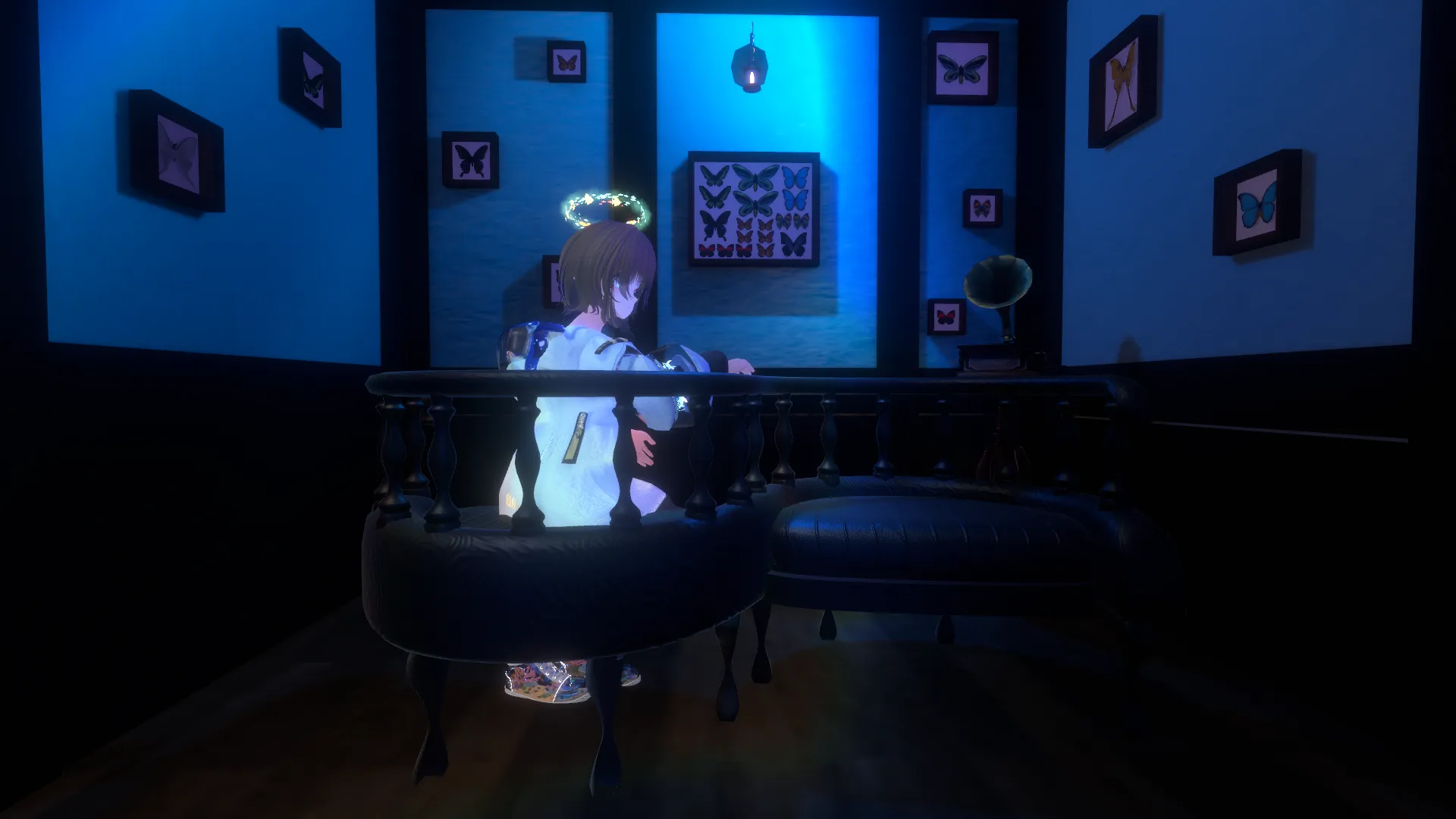 wolframちゃんベースです。nおさかなパーカーとおさかなの靴とおさかなヘイローをつけています。n髪型はインナー水色のグレーウルフです。