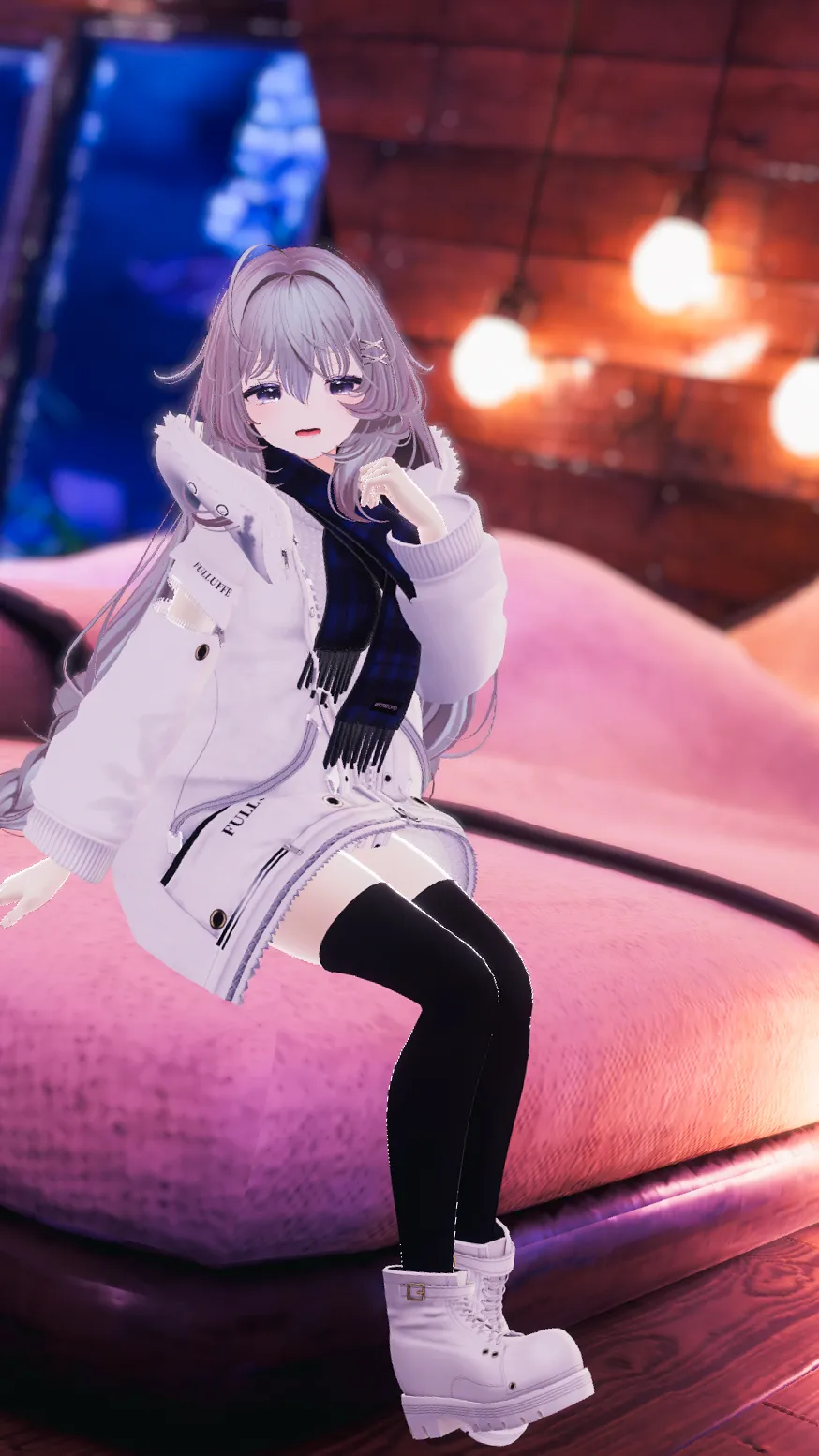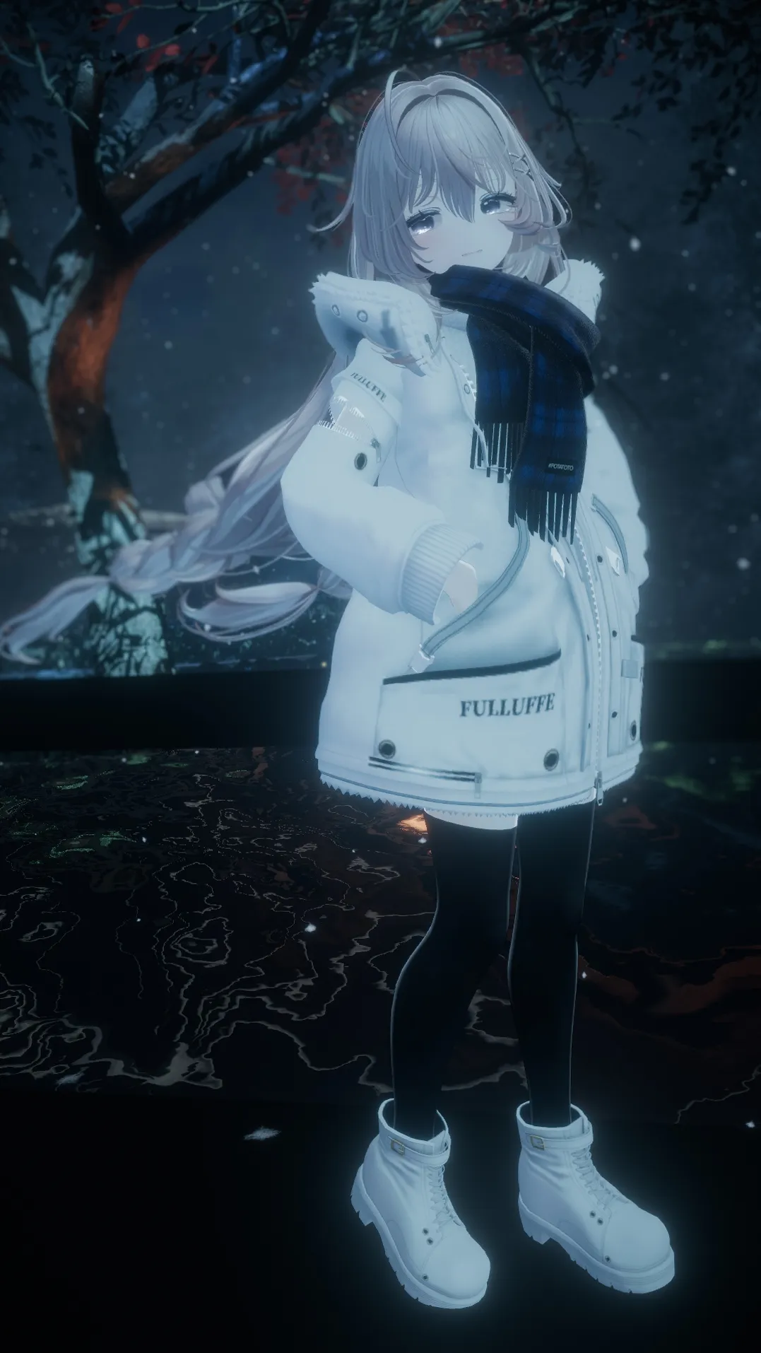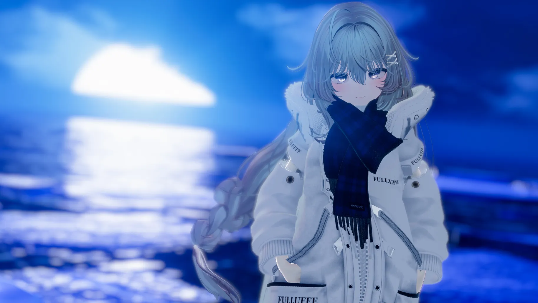 ふわふわのジャケットに合うよう髪や表情なども優しい雰囲気にしました。n首元のマフラーもボリューム感と柔らかい質感が素晴らしいです。nn写真では感じづらいですが、瞳に角度でキラキラと光るテクスチャを適用しています。n光る雪や樹氷を連想させ、こちらも気に入っています。