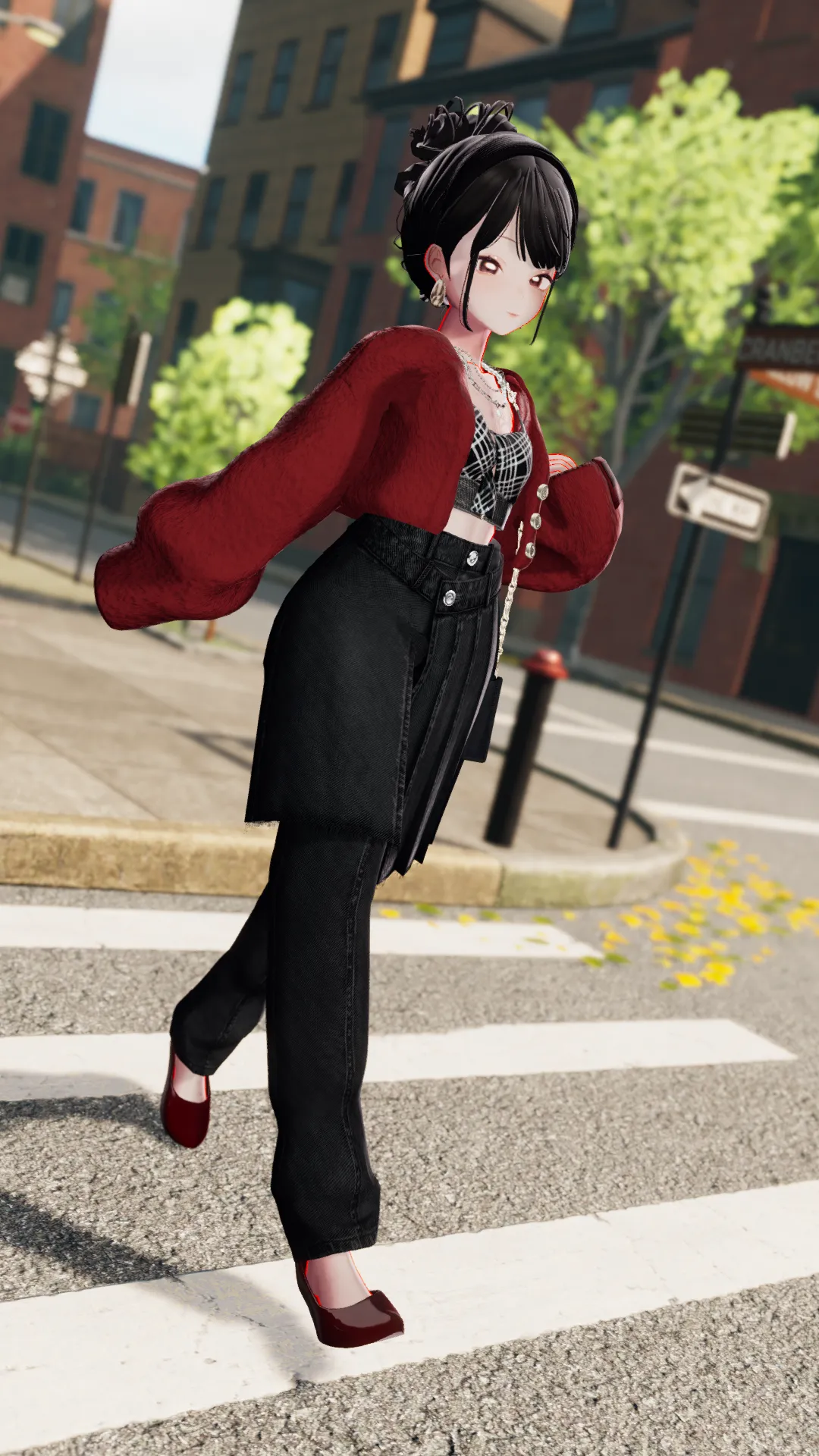 トレンドの赤と黒のデニムで大人っぽく着てみました!nインナーのチェックをポイントに秋らしい大人カジュアルをイメージしてます!n最近購入したボリューム感のあるお団子ヘアもお気に入り…!?