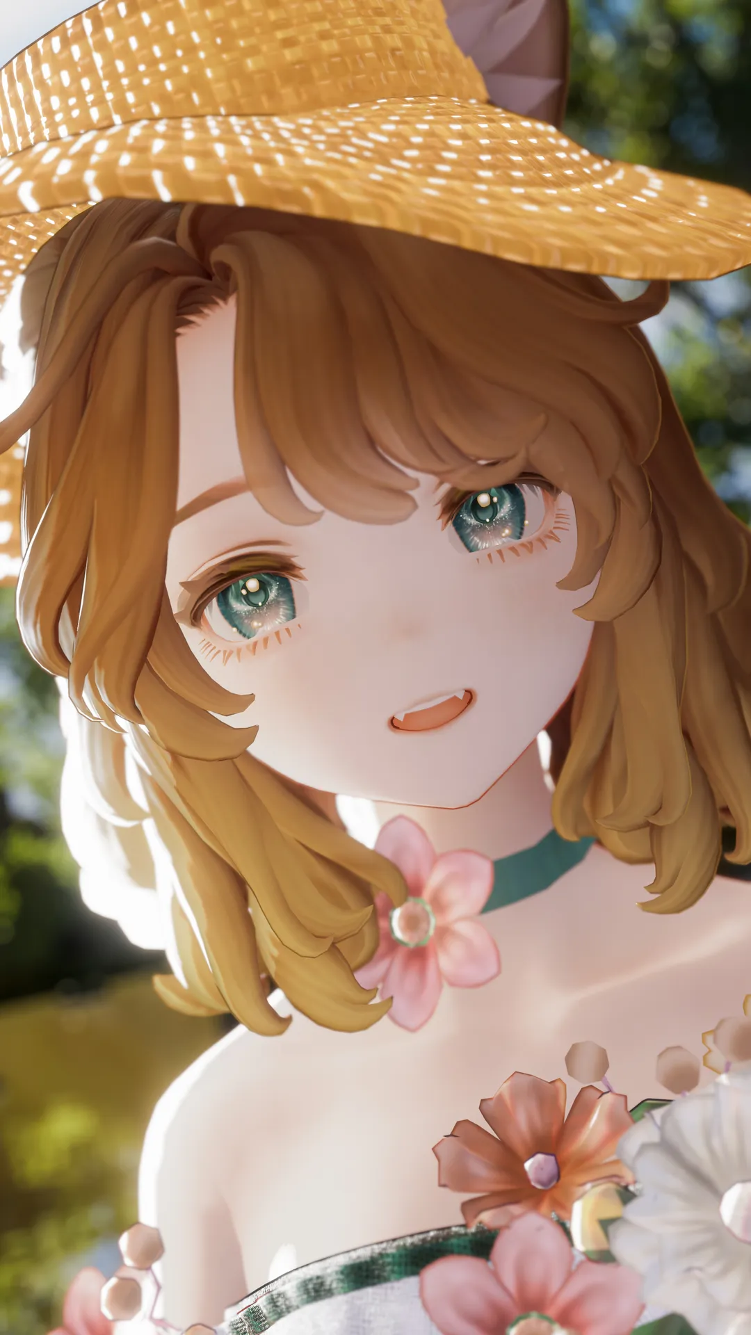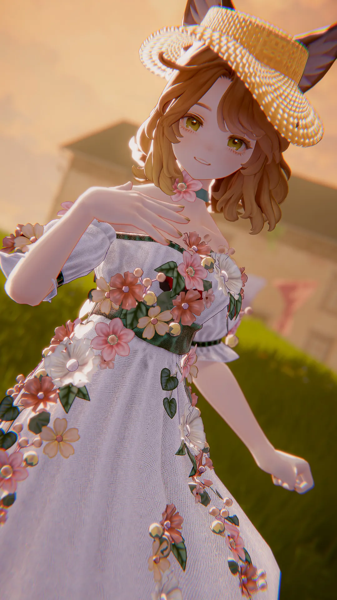 初めてのマリシアちゃん改変n柔らかな雰囲気とデフォルトで着ているお洋服にあるお花の刺繍がとっても好きだったので初めての改変はお花をモチーフにしたのにしよう、と思っていました。n前から着てみたかったみつあみさんのお洋服をBlenderで調整して着せてみましたn(Unityでもいけるっぽい!)nお帽子はNookNookさんのあの夏、ですnnこの改変に引っ張られてアイテクスチャが完成したといっても過言ではないので、お気に入りのマリシアちゃん改変です
