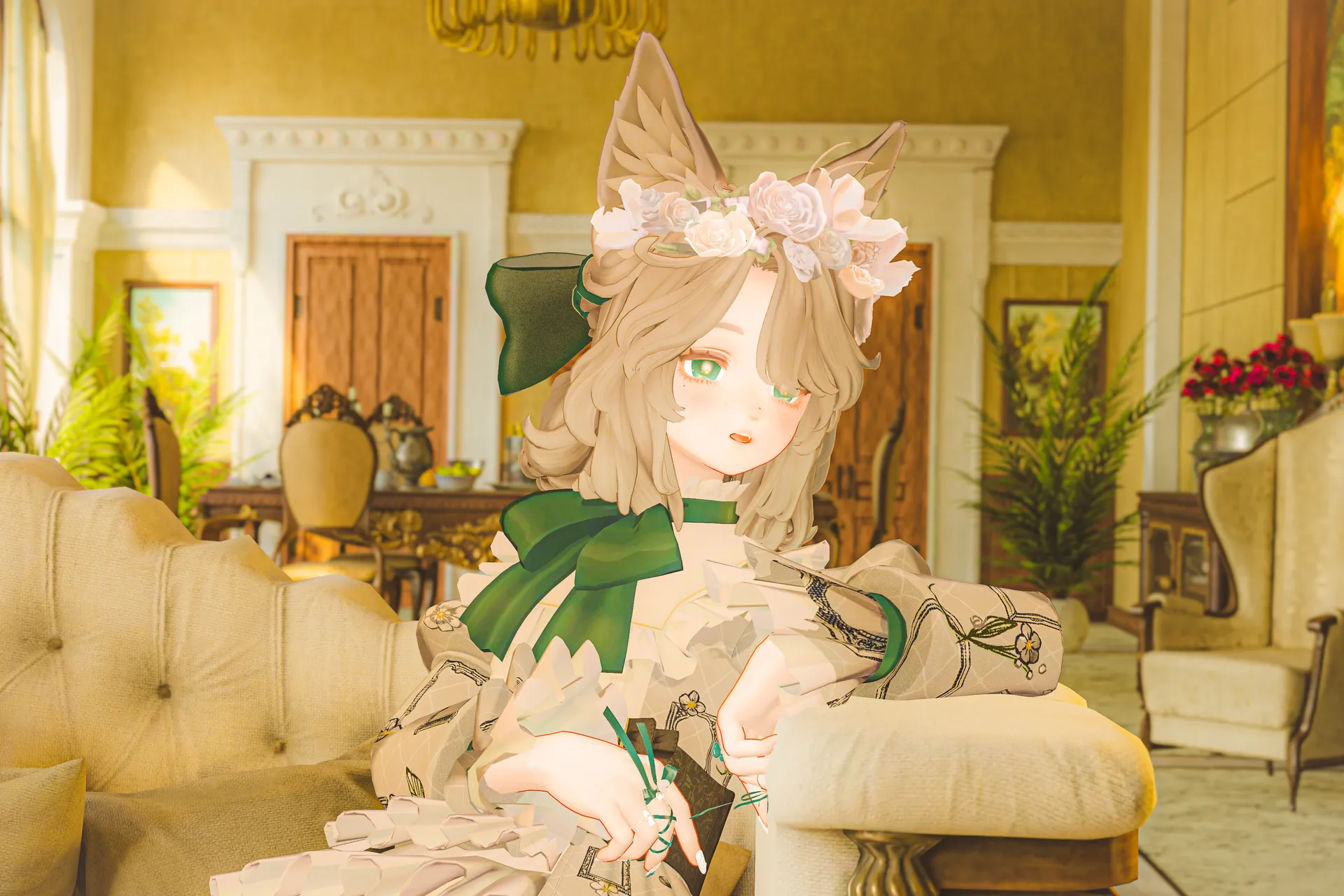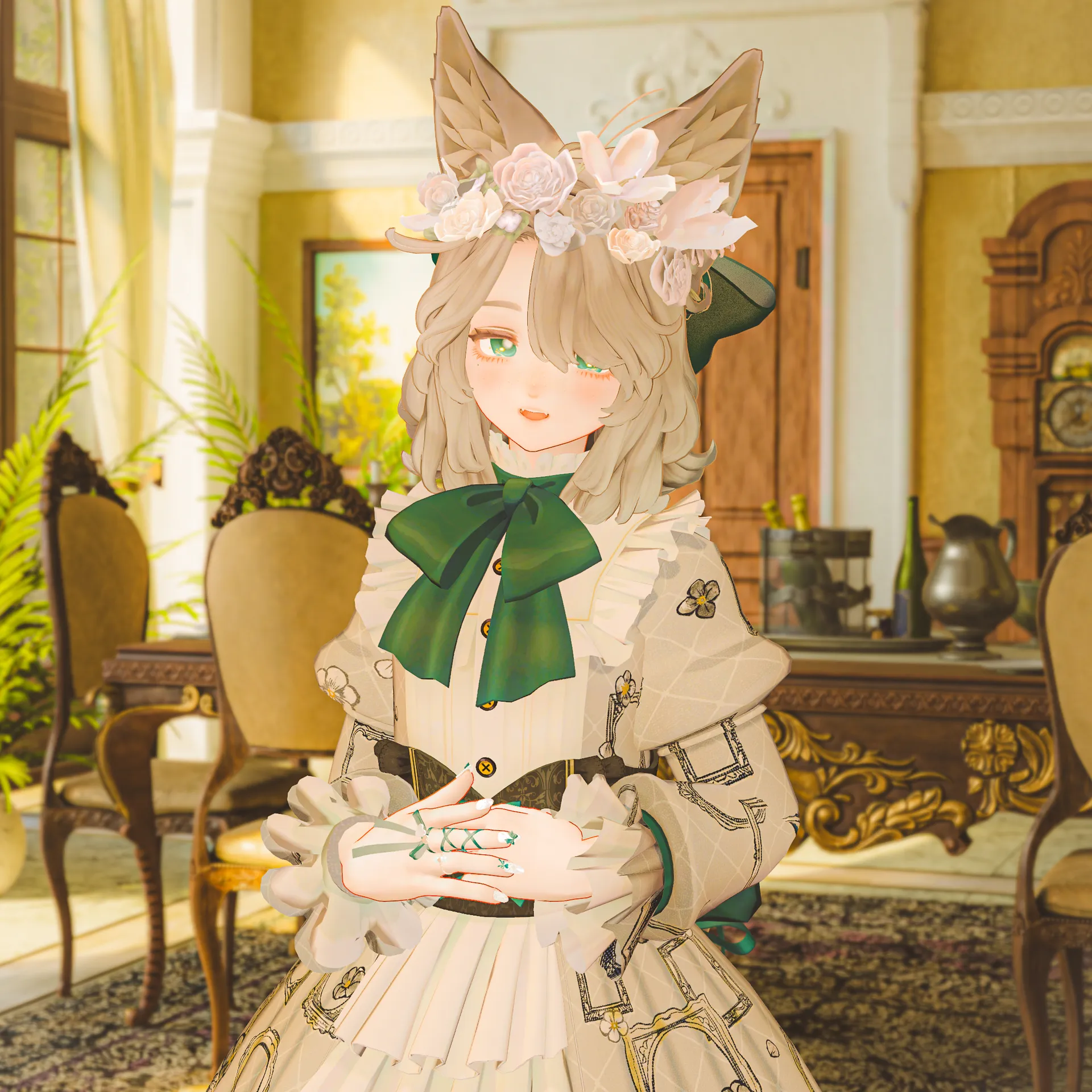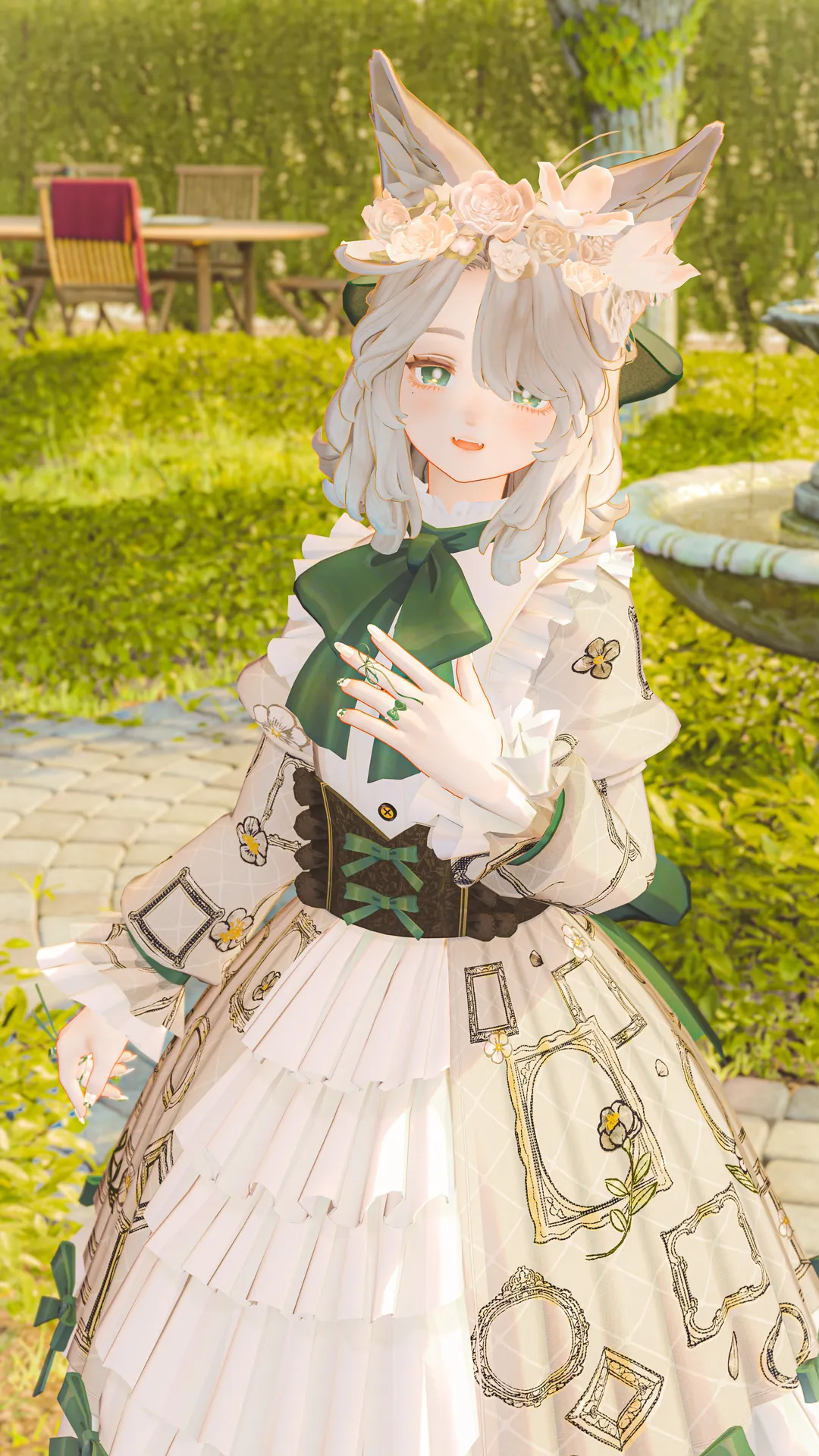 1058martさんの『ショコラロリータ』(マリシアちゃん非対応衣装)をメイン衣装にし、アクセサリーでリボンマシマシにしました。n儚げな白瞳孔がお気に入り。