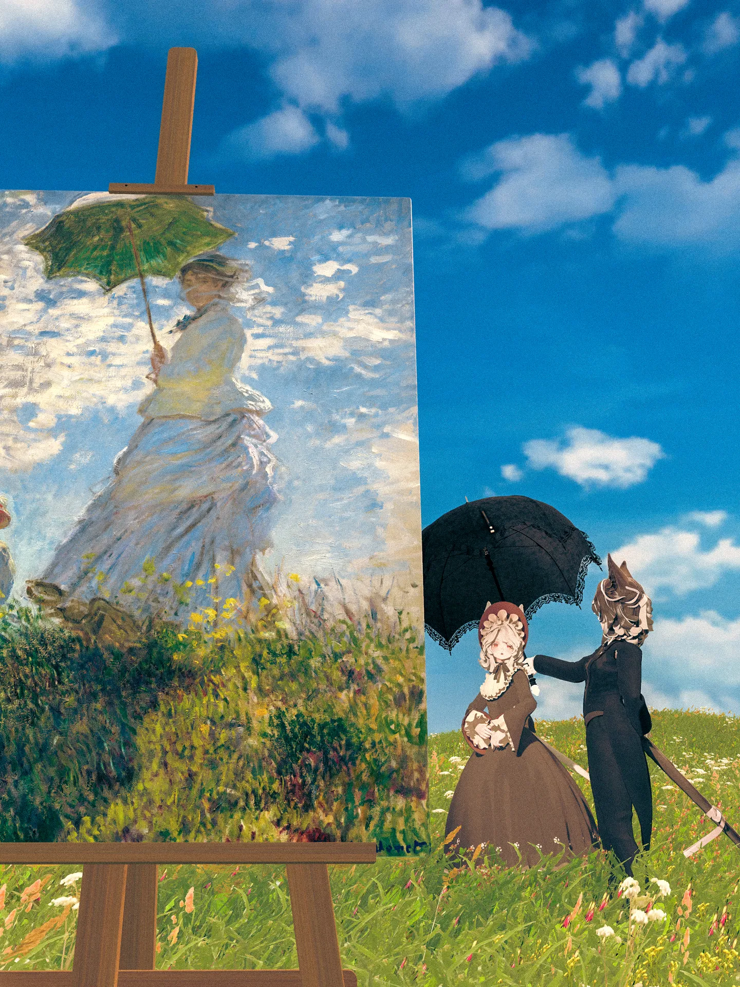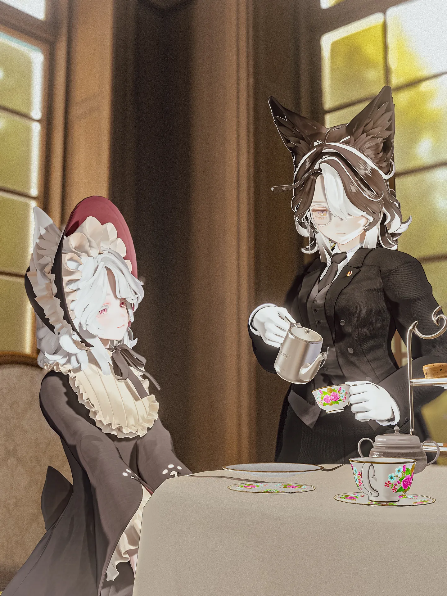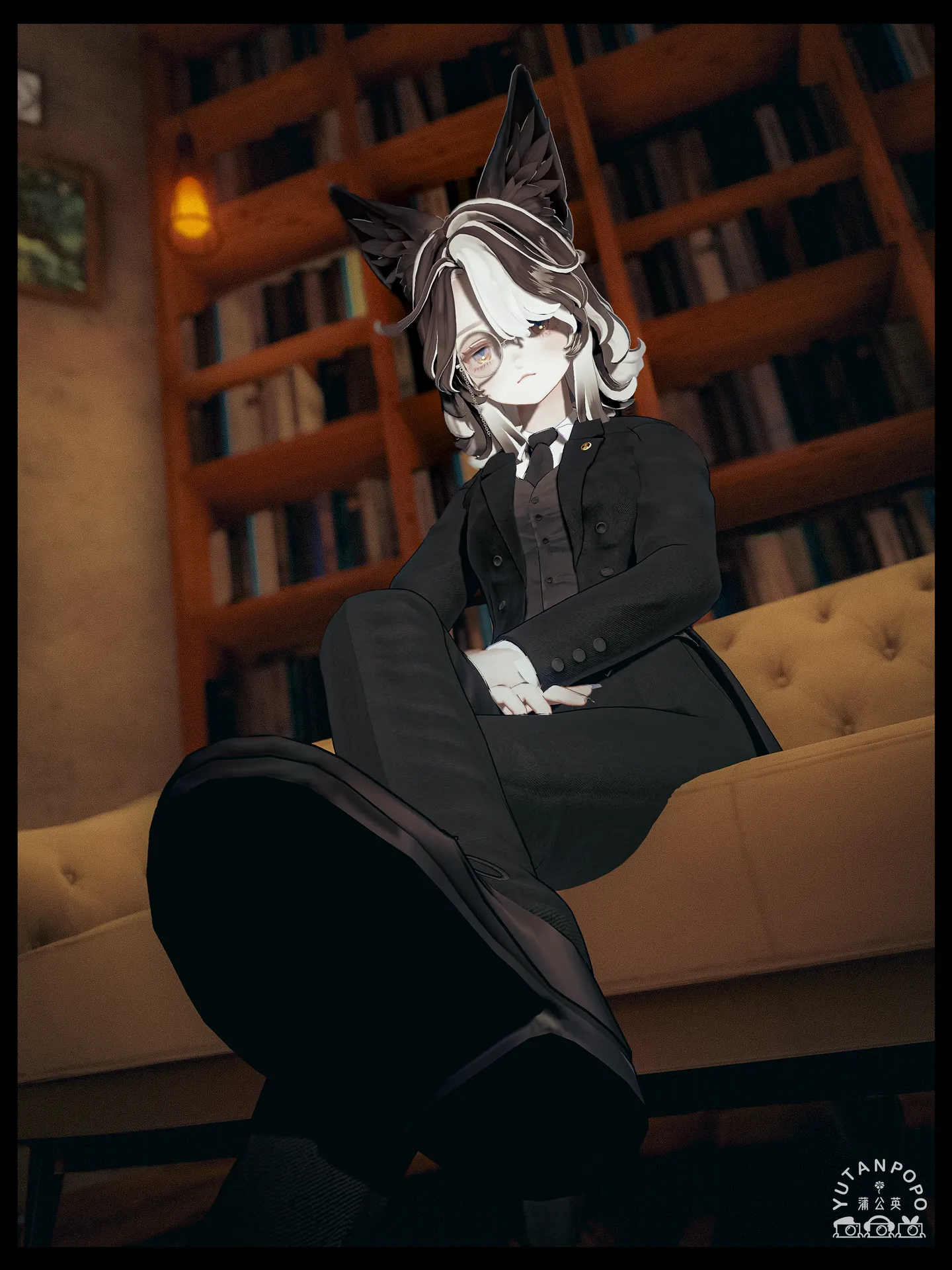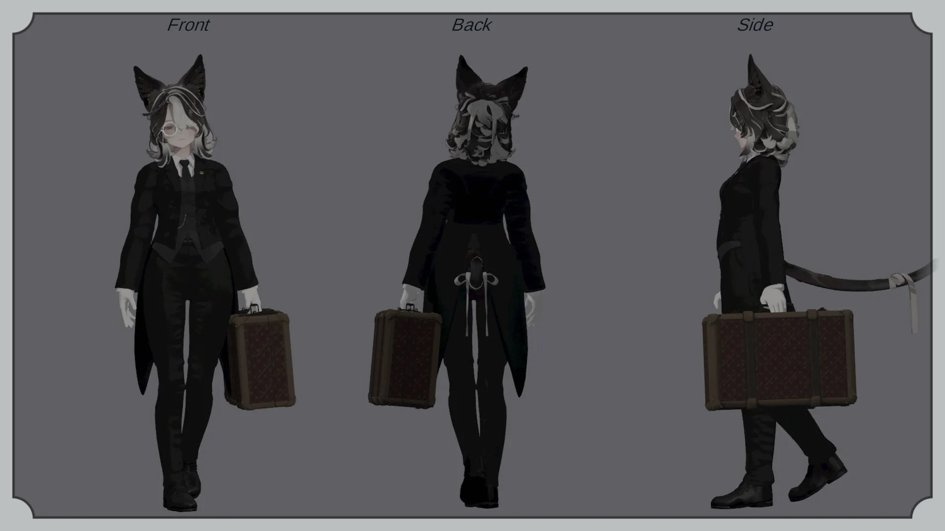 マリシアちゃんを執事に改変してみました。nサムネではしていませんが、白い手袋をしています。nお嬢様についていく為にトランクケースと黒い日傘を持っています。n胸に着いているピンバッチはVRC内のイベントで配布している物です。n