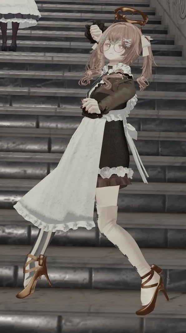マリシアのバレンタイン風コーデです。n頑張ってチョコ作ります。nショート丈ニーハイエプロンは癖です。nnチョコ意識のブラウンで統一感出しつつヘアピンがチョコミント色で可愛い。nチークメガネと言うものを教えてもらったけどめちゃくちゃ可愛くてハマりそう!