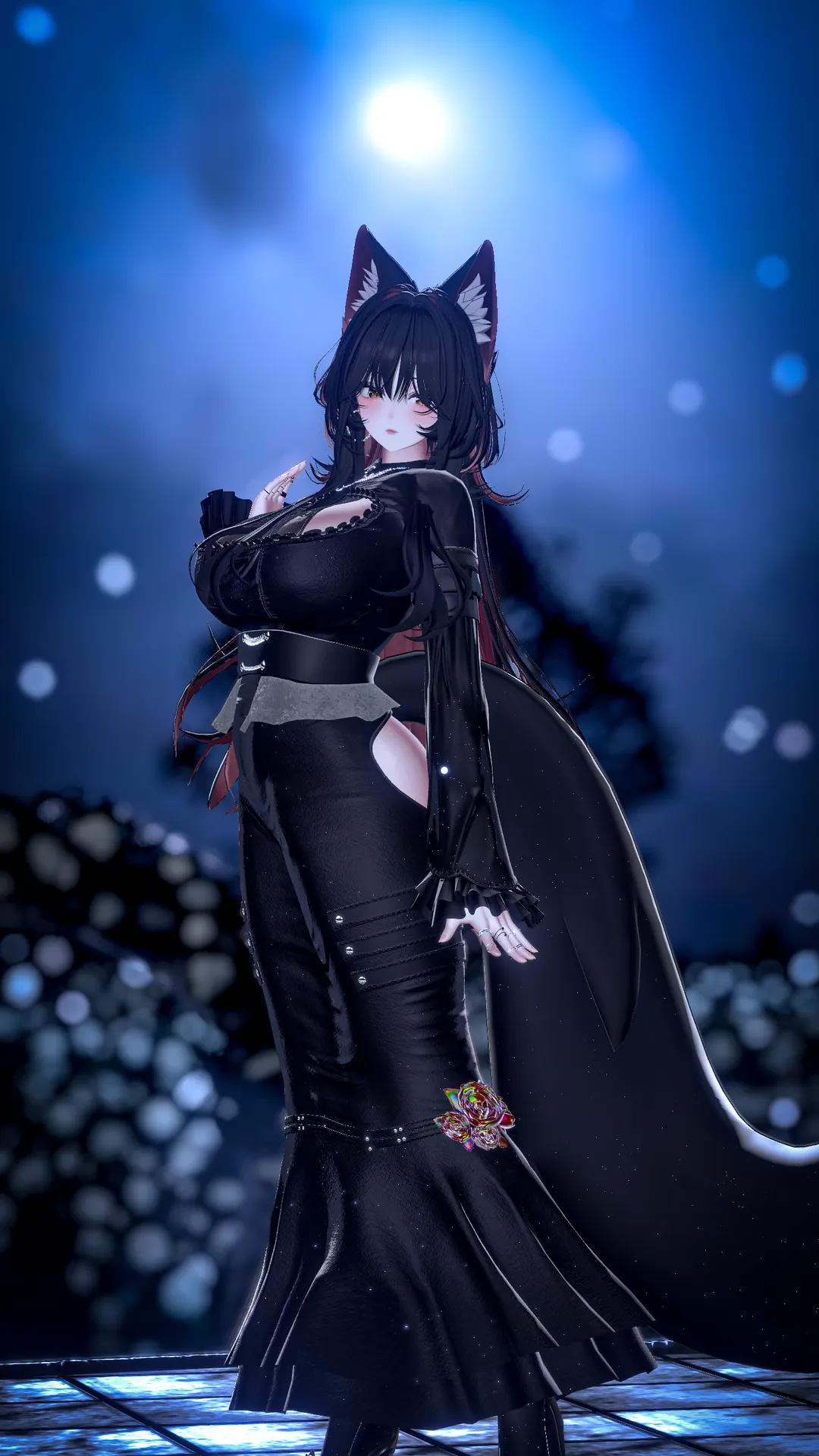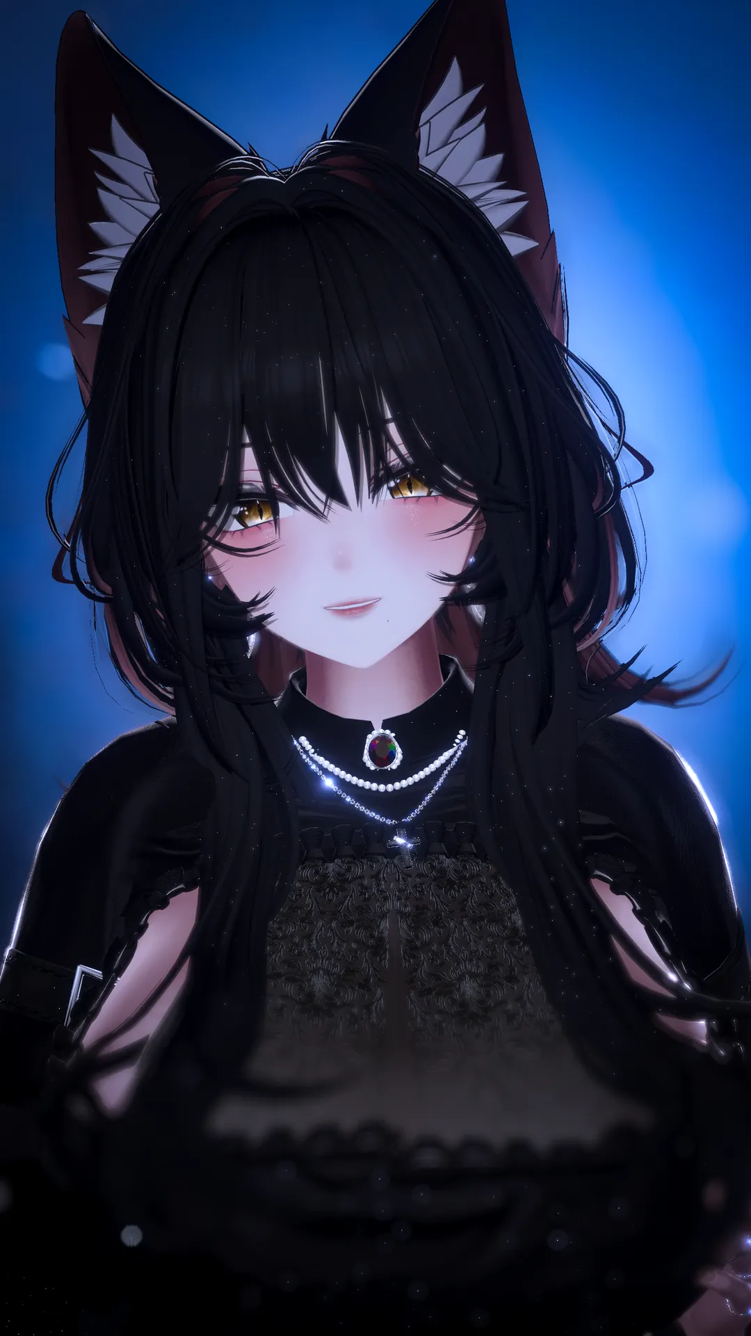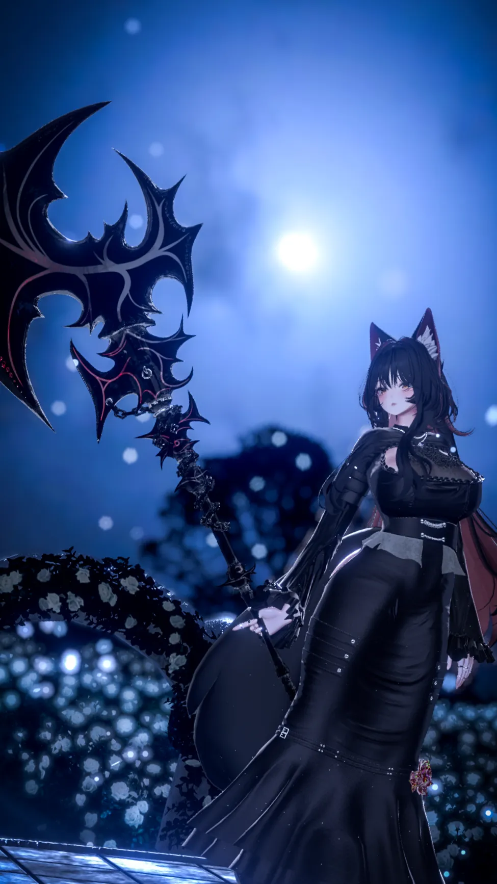 漆黒の長髪に金の瞳を持つ、美しくも危険な妖狐。n黒のドレスに身を包み、巨大な戦斧を操る裁きの使者。nその一撃は無慈悲でありながら、どこか静かな哀れみを秘めている。n冷たく孤高な佇まいの奥には、僅かに氷のような温もりが宿る??nそれを感じられるのは、彼女に選ばれし者のみ。