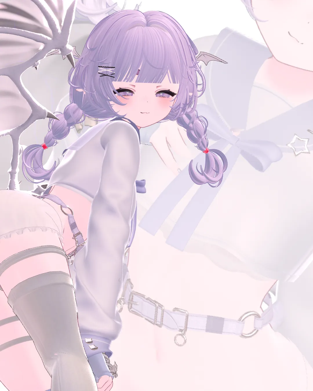 ショコラちゃんがベースです。nいたずらっ子っていうか不器用な幼いみたいなイメージで作りました。n服はPISCES、えんじぇる?せーらびっと、小悪魔サキュバス - リリス、Love?Cubus、SimpleDrawers、SeisoSweetSetの融合です。nn髪型:Chibi Girl Cutie Braidnネイル:Simple Gel Nail