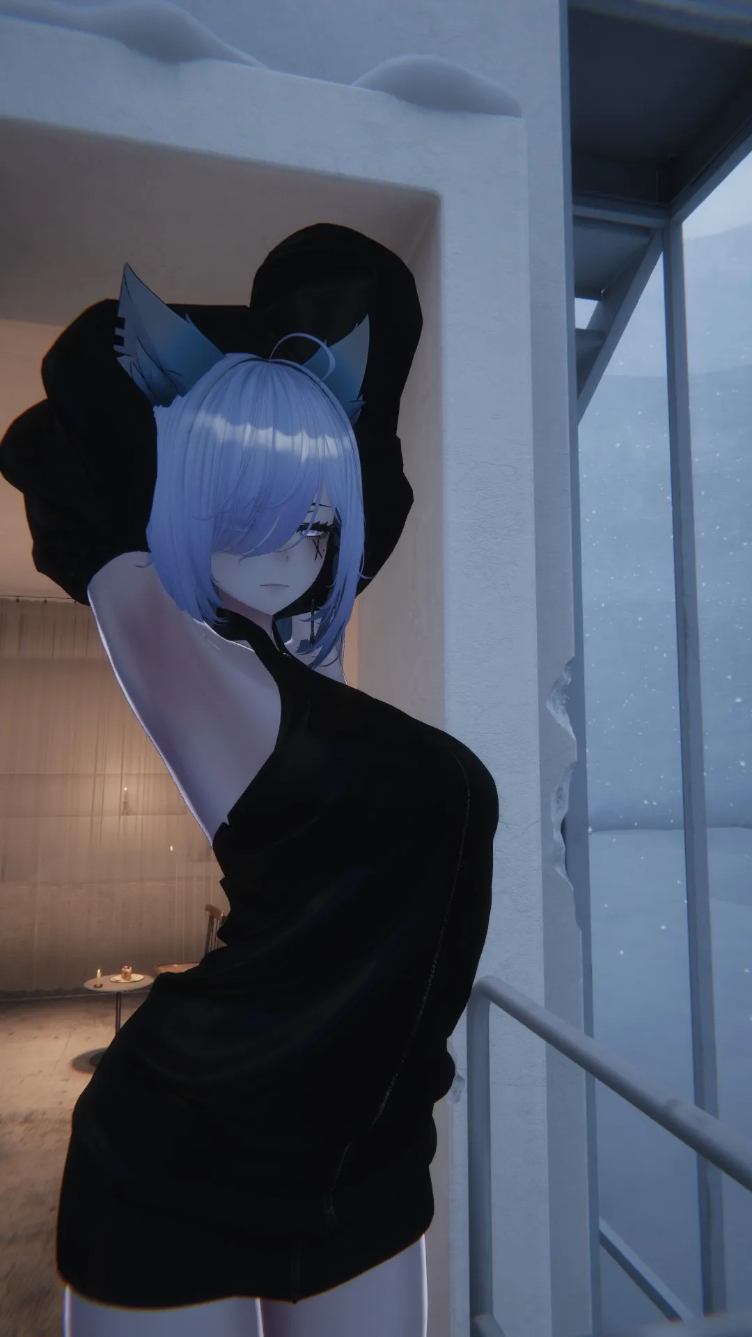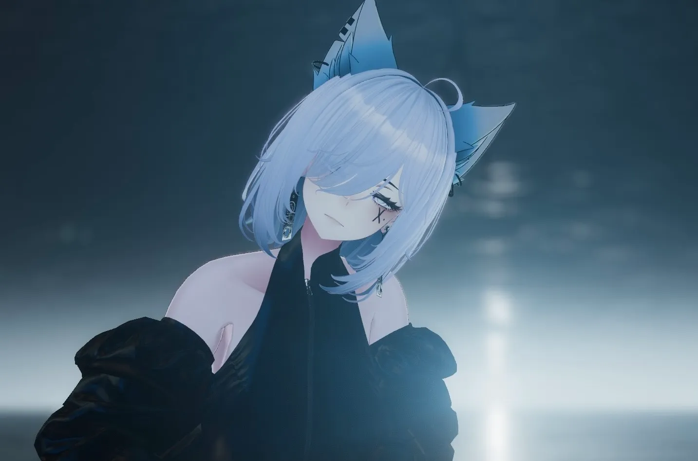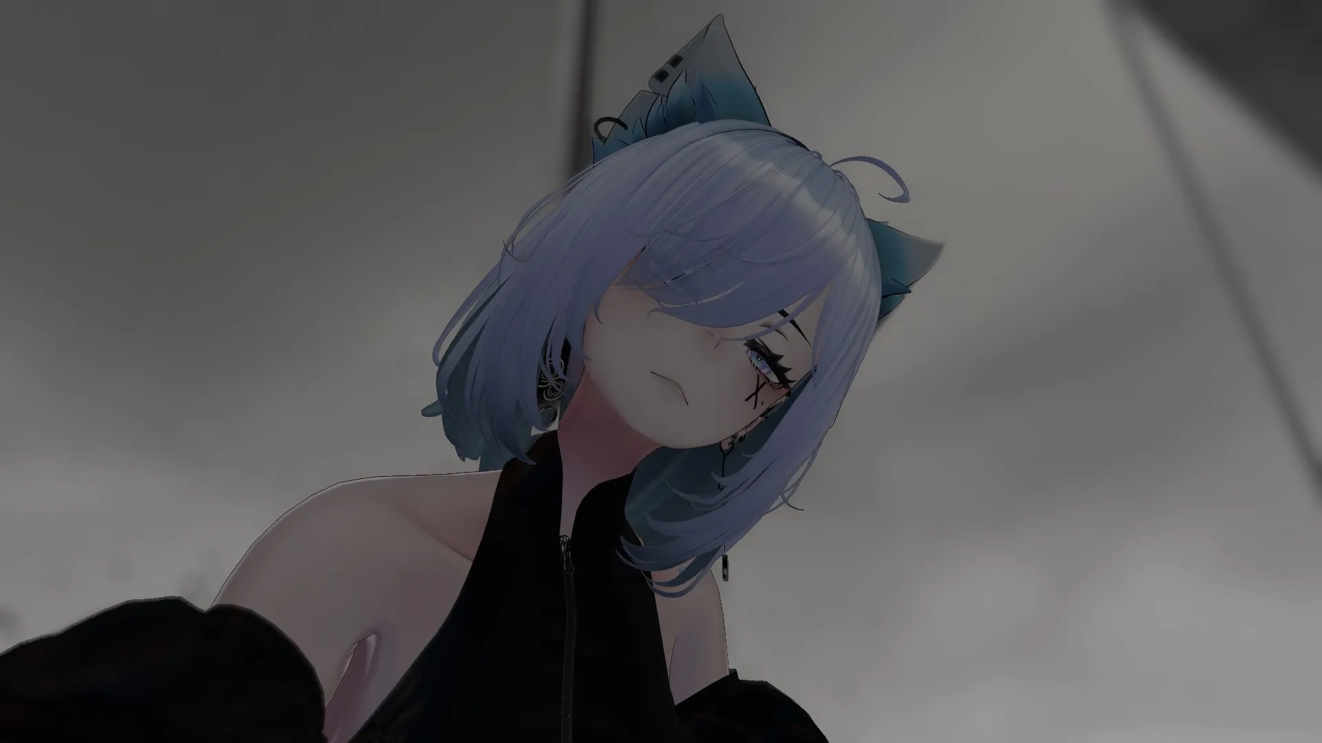 青みがかった髪と冷たい空気を感じさせる背景が、穏やかでありながらもどこか孤独を思わせる。前髪で片目が隠れ、視線を落とした表情には、深い思考や感傷が漂う。黒のファッションが全体を引き締め、シンプルながらも洗練された印象を与えている。n 顔の「X」マークがアクセントとなり、彼女の個性と過去を想像させるポイントになっている。