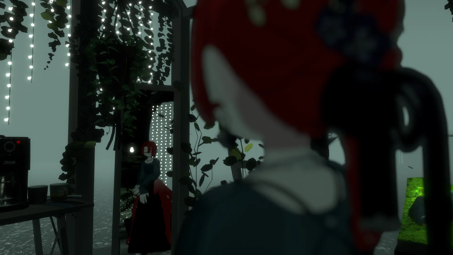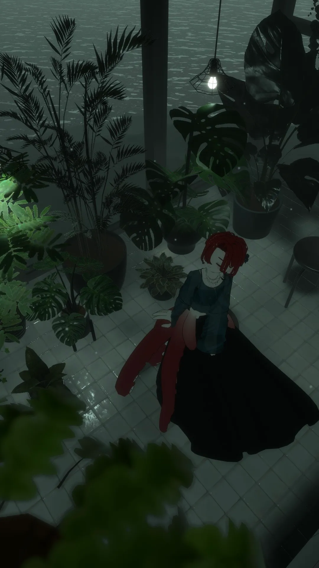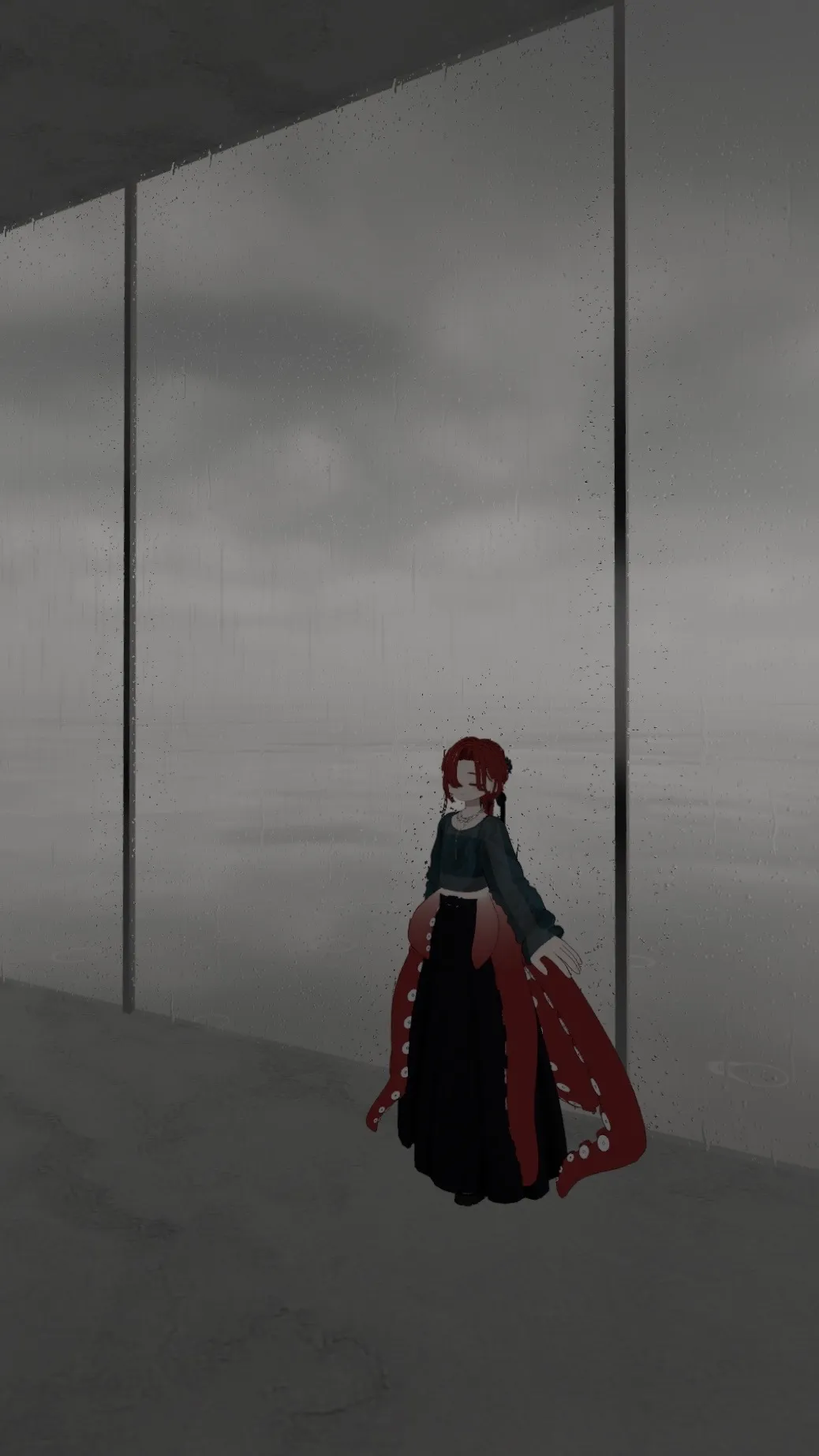 落ち着いた青緑のシアートップスに黒のロングスカート。n三つ編みアレンジで上品な華やかさを。