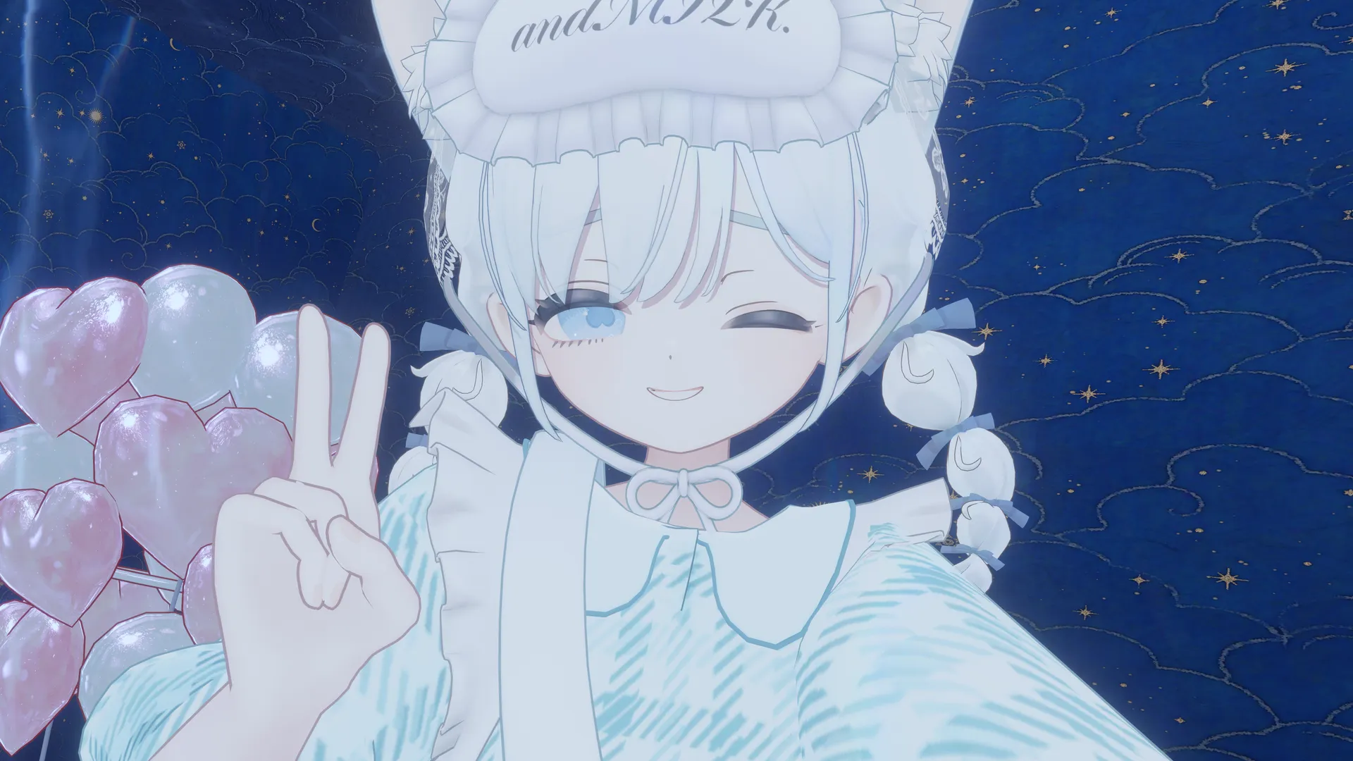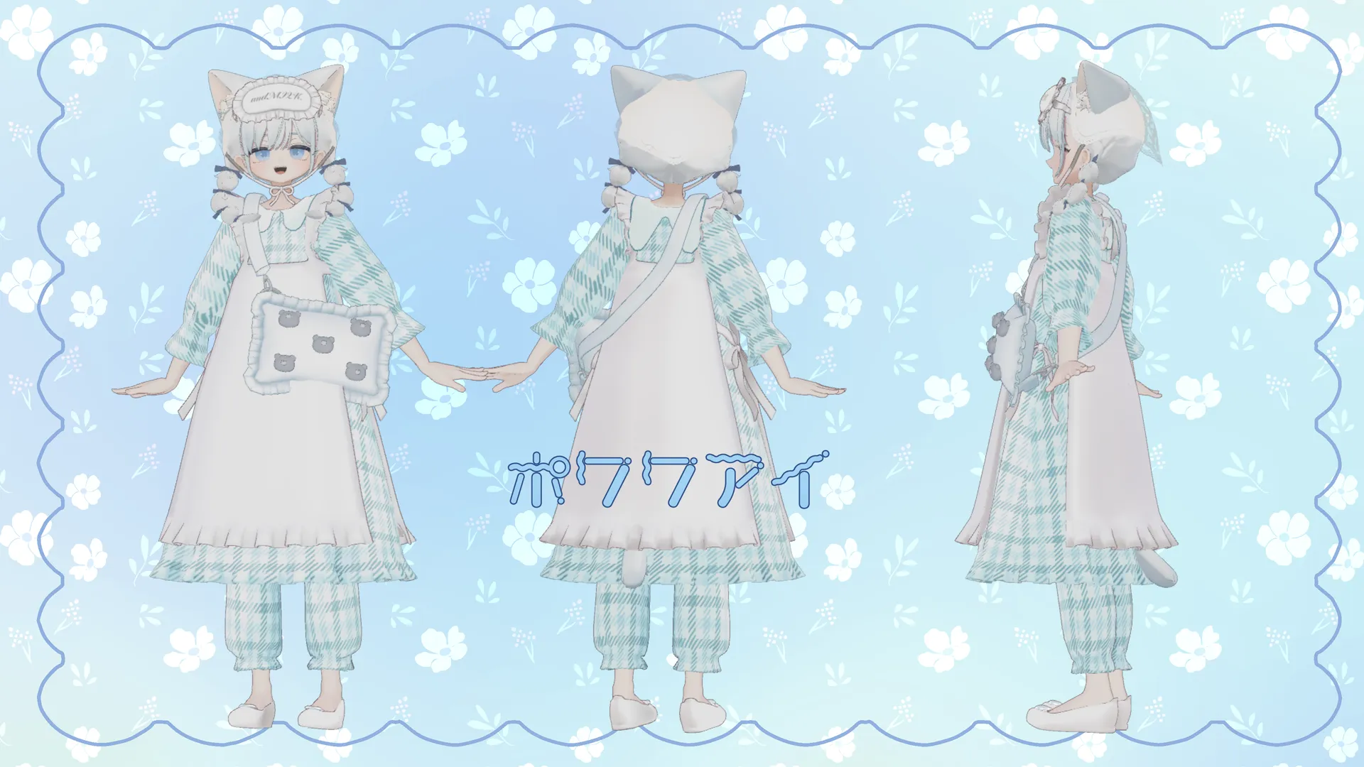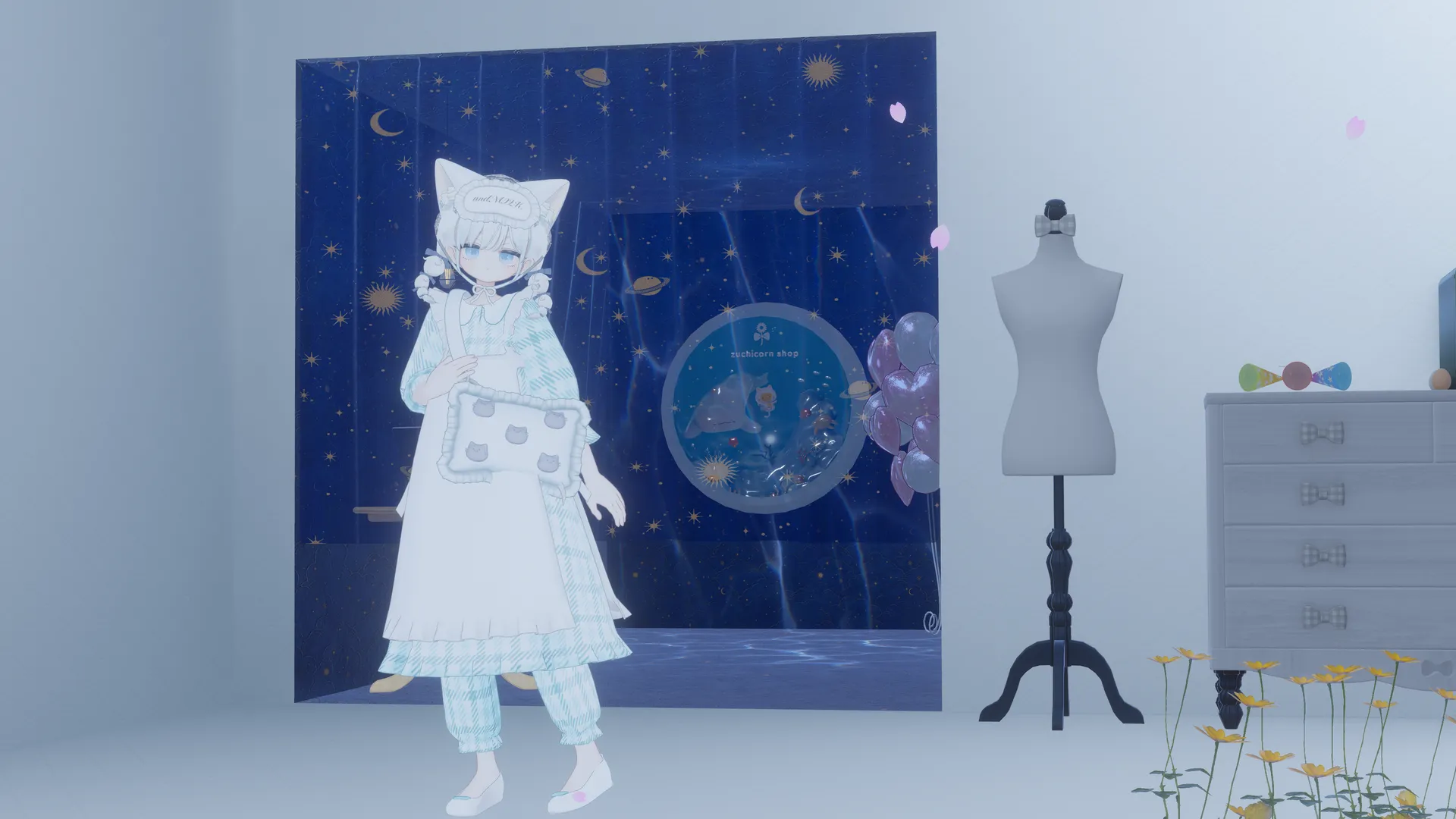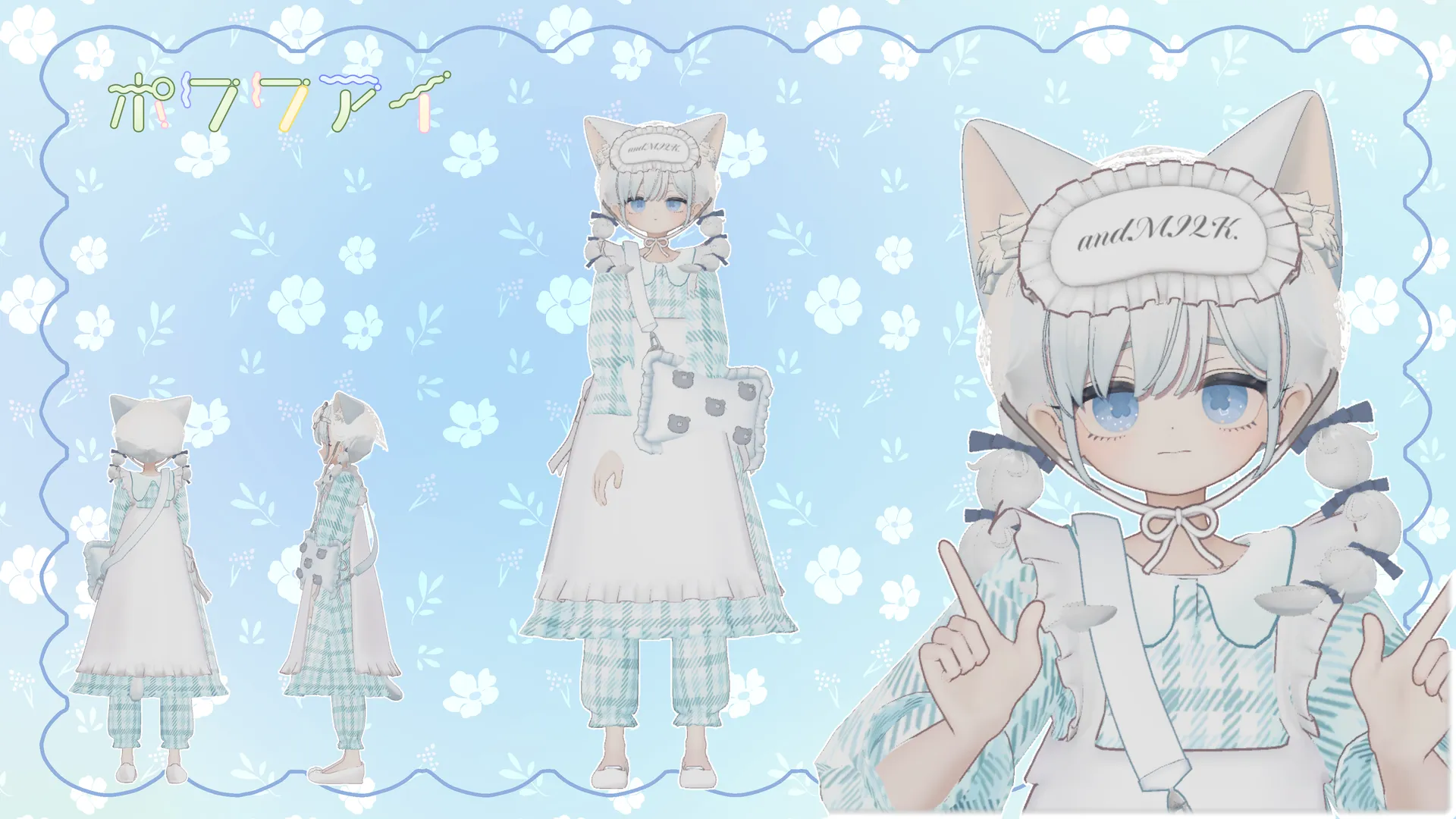 ことね元々欲しいな~と思っていた衣装がしらつめちゃん対応してたので即購入でした。n後ろ髪は非対応のゆるポップツインヘアーをblenderに持っていってこねくり回して合わせました!n絶対しらつめちゃんに似合うだろうな~と思ってたので、めちゃくちゃ可愛くて嬉しいです。nnアイテクスチャは自作でシロツメクサから草原をイメージして目の中の柄を作りました。nliltoonの機能にあるUVスクロールを使って模様が横に流れていくアニメーション風に設定してます。nnmemo---nしらつめのマテリアルのライティング設定がデフォルトと少し違うので、nワールドによっては色合いが変わったりすると思います。nデフォルトと違う部分⇒ 明るさ下限0.1/ライトのモノクロ化0.5nまた、オブジェクトのAnchorOverrideの設定をすべて統一してあげるとさらにいいと思います。nnnnアバター□https://harunopupu.booth.pm/items/6831821nアイテクスチャ□https://booth.pm/ja/items/6846953n髪型 前髪□デフォルトn髪型 後髪□https://booth.pm/ja/items/6373100n衣装&アイマスク&鞄&靴□https://booth.pm/ja/items/6796653