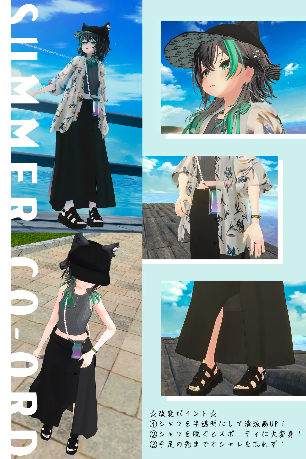9店舗のショップアイテムを使わせてもらい『SUMMER CO-ORD』を改変しました!rn夏服ということもあり、半透明のシャツにインナーのタンクトップ、スリットスカートで涼しさを感じれると思います!rnカジュアルであり、スポーティでもあるような服装をイメージしており、rnシャツを着ているとカジュアルに、シャツを脱ぐとスポーティになる2wayなコーデを組みました!!rnrn~改変ポイント~rn①シャツを半透明にして清涼感UP!rn Photoshopなどの画像編集ソフトを使用して不透明度を調整すると半透明になります。rn ※衣装によってはマテリアルやシェーダーの調整が必要なものもあります。rn②シャツを脱ぐとスポーティに大変身!rn③夏は肌見せが多くなるので、手足の先までネイルやアクセサリーでオシャレを忘れずに!