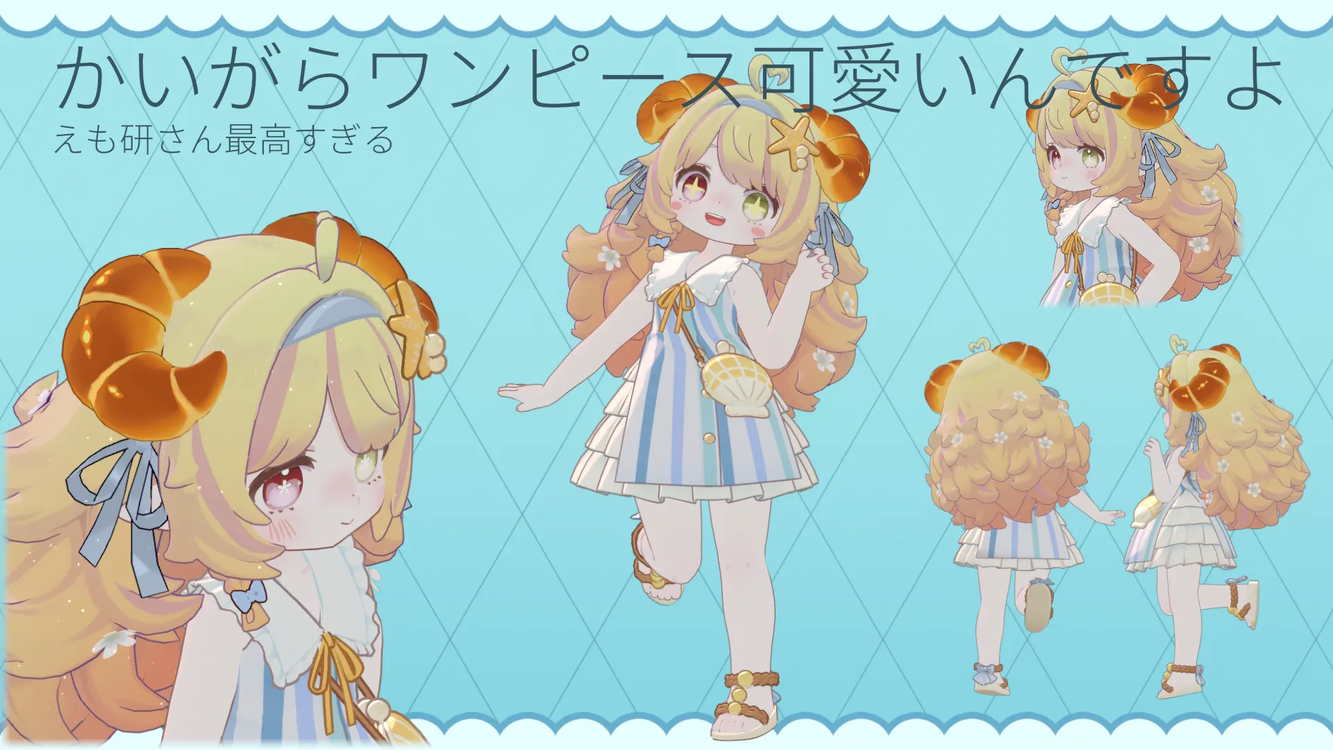かいがらワンピースがめっちゃ良くてですね!!!!!rnメニューからアクセやバッグや靴を非表示にできるのも便利でたすかる…!rn肌やおめめとかのテクスチャも素敵なの使わせていただいてるのでそれのリンクも載せたかtt
