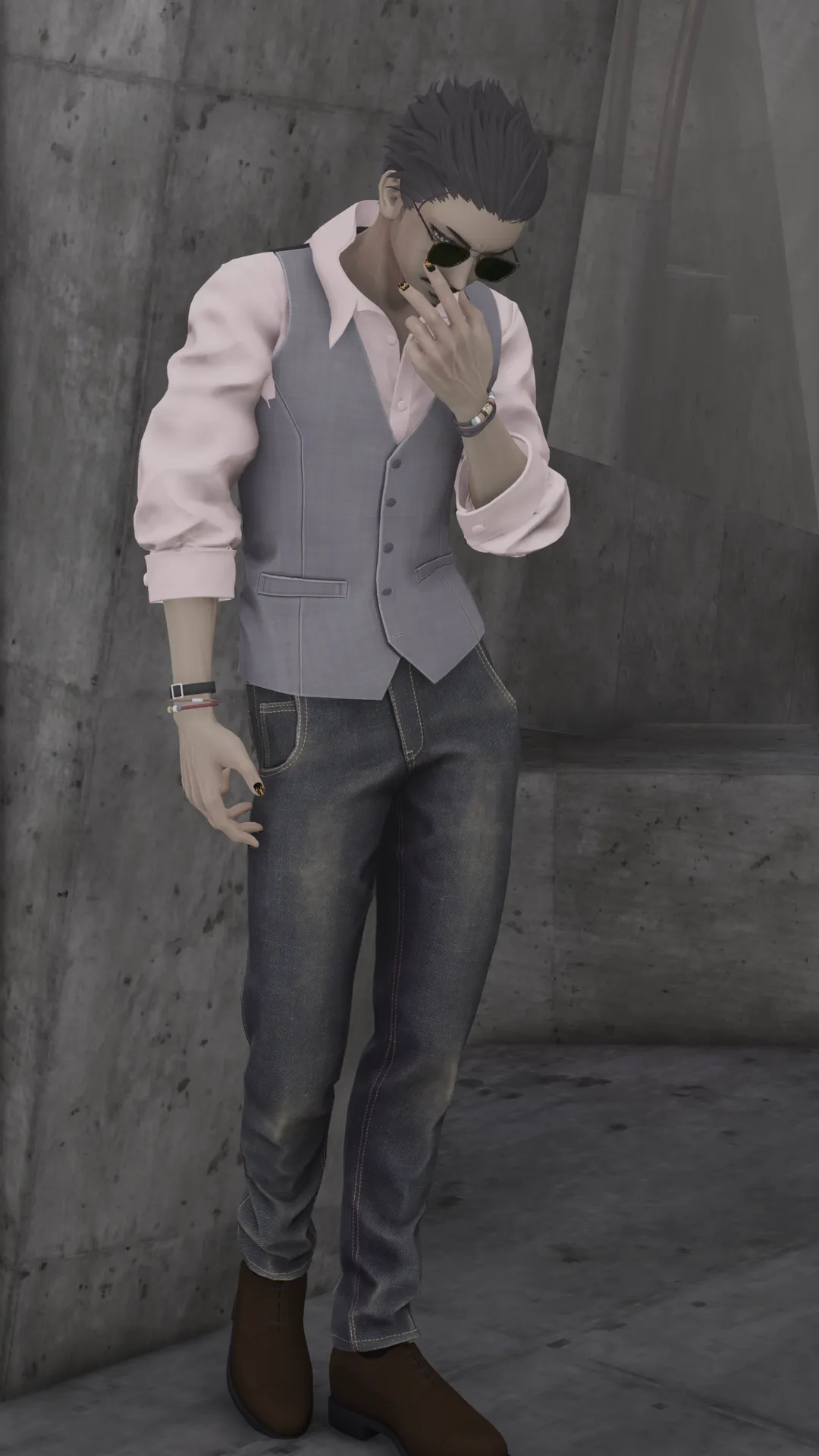 自分がリアルで普段着る服装を再現してみましたrnblender等を使って衣装合わせ、髭と眉、サングラスは自作です。rnMeshDeleterを使用してロマドくんの服からブレスレットだけとったりしてます。