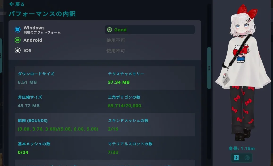 がんばったらGoodできました。rnLOWRYS FARMのキティコラボアイテムをビッグリボンでさらにキティちゃん寄せ。rnTexTransToolとAvatarOptimizerを使ってます。