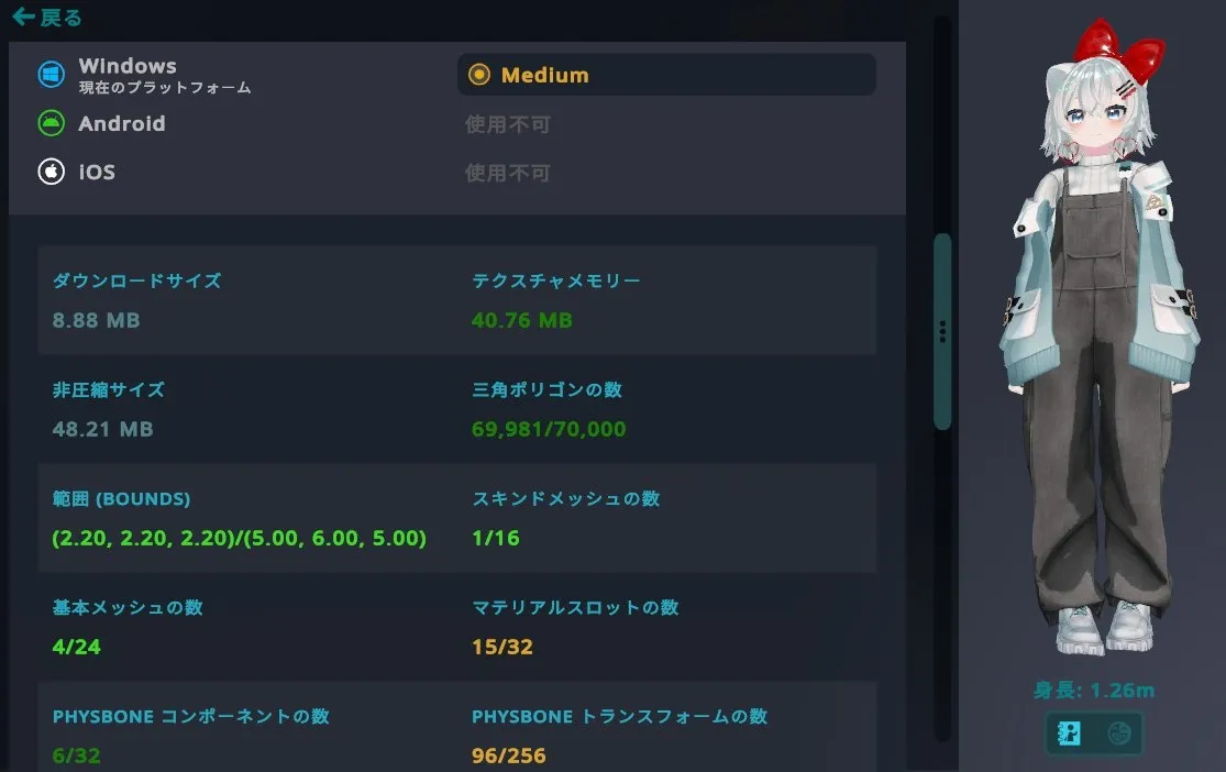 青色クラブとサンリオVfesコラボ回のために用意した改変です。rnオーバーオールと白のハイネックでキティちゃんらしいバウンドコーデに青色クラブ要素を足してみました。rnAvatarOptimizer、TexTransToolを使用してます。また、小物はBlenderでポリゴン数を削減しました。