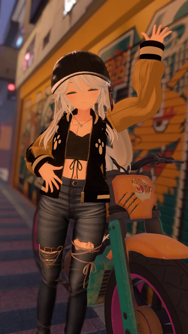 スカジャンを着るにあたって悩んだのがボトムス!rnミニスカも良いのですが、カジュアル感を強めにしたくダメージジーンズをチョイス!rnスポーツ感もあるといいなと別の衣装から帽子とスニーカーを着用しrn色を合わせて完成となります!