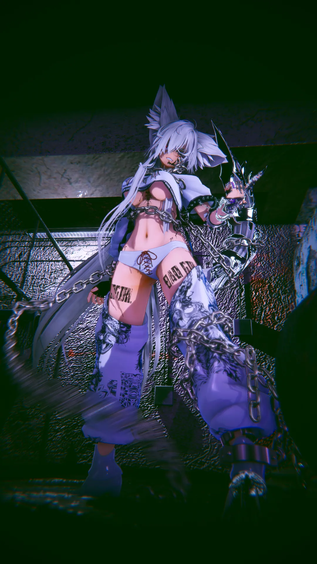 左側を中心にアーマーリングを指、手首、足、顔、尻尾に装着し、鎖で左半身を縛られた仙猫 服は豺狼 解放×封印・善×悪