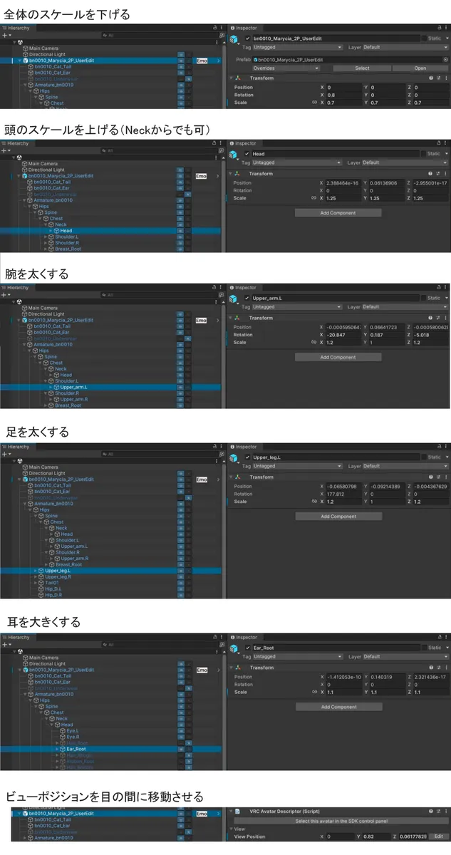 Nekonaku注:タイトルを「すゝめ」としましたが、当改変により発生した不具合については、当方は一切責任を負えませんので、ご了承ください。rnrnVRChat内のExメニューからクイックアクションにてアバターの身長を変更できますが、それだけではただの小人化(参考画像1枚目左)なので、頭身等を変更して子供っぽく見せる為の改変内容になります。rnrn基本的にはArmatureのScaleを変更していきます(参考画像2枚目、手足については左右とも)。rn画像の数値はあくまでも参考値で、ご自分で理想的な数値を探ってみてください。rnTransformの値をいじる都合、髪型やアクセサリ類は該当のArmature下に事前に配置しておくと、再調整が要らないかもしれません。rnまた、服によっては襟、袖口、裾等にズレが生じる可能性がある為、そちらは必要に応じて調整してください。