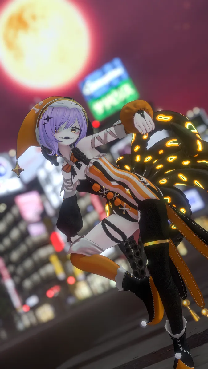 ハロウィン用で改変した、タコでピエロな感じのしなのちゃんですrn帽子の部分はメッシュとボーンをBlenderでいじってます