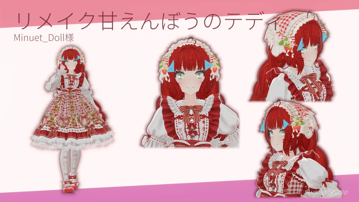 MishimaHiaka#PR #リメイク甘えんぼうのテディrnリメイク甘えんぼうのテディちゃんはもうすぐ11日に発売ですよ!rn今回はてんぱすおおもり様のいちごロリィタを着せてみましたrnマヌカ対応で非対応衣装チャレンジしましたが、MAの「位置を元アバターに合わせてリセット(全チェック)」でいい感じに着せられました!rn頭かざりはコラボのバブーシュカを合わせて可愛いを盛りました◎rn髪型はミルティナ対応をお借りしました!rnスケールをX1.2 Y1.2 Z1.3(気持ち縦長?)にしたら、テディちゃんに合わせられました◎rn元々のテディちゃんの髪にラメがあったので、こちらの髪型にも頑張って導入してみました!rnマットキャップもテディちゃんからお借りしていますrnマットキャップを合わせると、雰囲気を合わせられるのでマジおすすめです。テクスチャも描き直すとより合うと思います(小声)rnワールドはMinuet_Doll様の「Sweet sweets room - studio Minuet_Doll」を使わせて頂きました!rnhttps://vrchat.com/home/launch?worldId=wrld_a68413d8-f97e-4d95-af55-0779a7d49b94rn3面図はAvatar Studioです。rnテディちゃんの販売が楽しみですね…!!